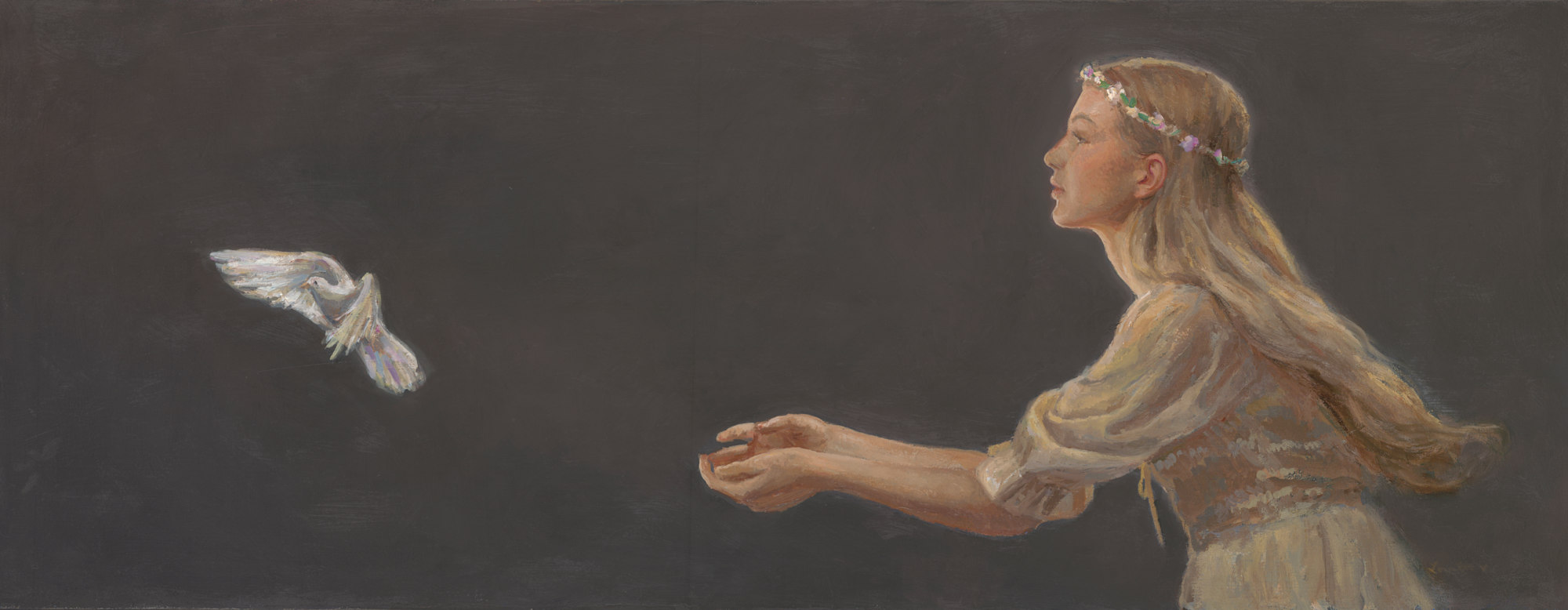 I love the dove as a symbol of peace and of the Holy Spirit. In this painting, I am thinking of the gesture of the young woman as both giving and seeking. She is a peace maker, sending her peace into the world around her. Simultaneously, she is seeking after the Holy Spirit.