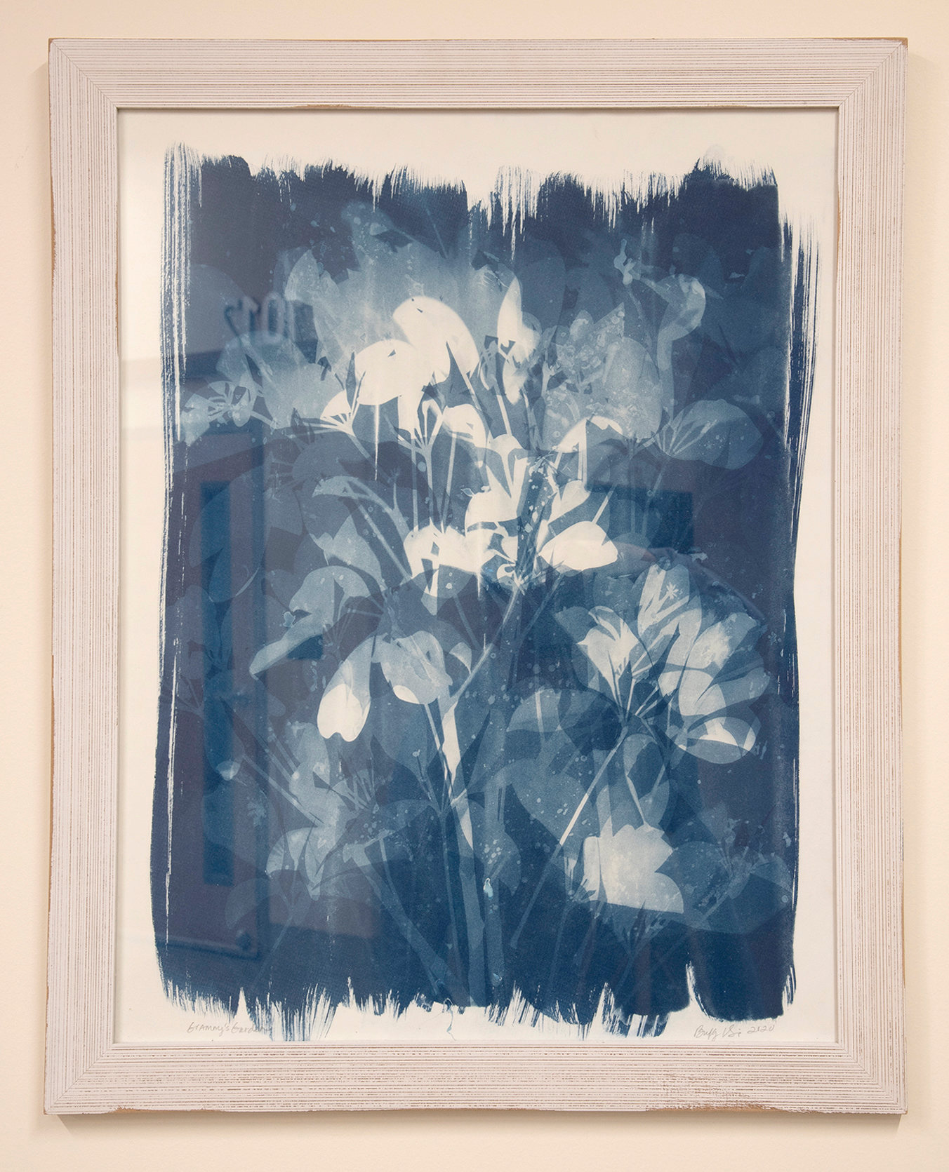 This piece is an ode to my mom, or Grammy as her grandchildren call her, and some of the plants from her garden which I used to create a Cyanotype. I use the sun (UV light), to develop the print, I then wash the paper to reveal a Cyan blue color print. Each piece is one of a kind and unique.