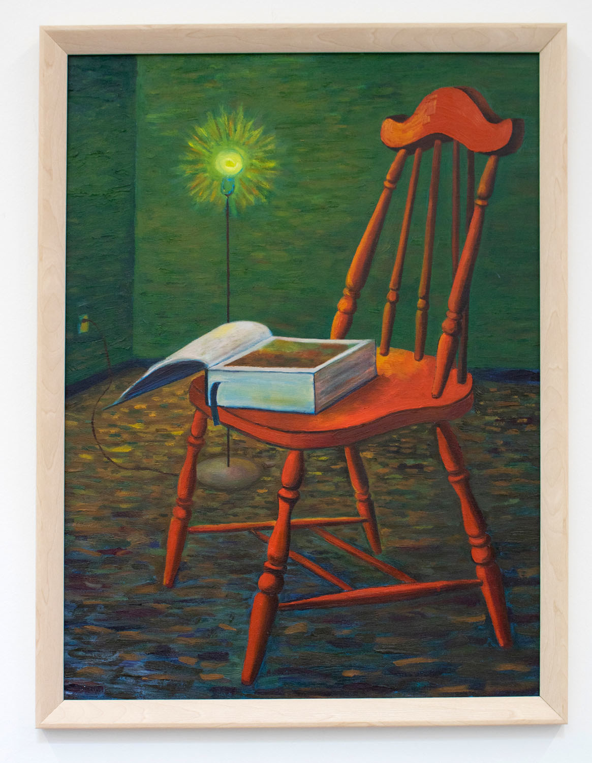 In Suschik’s piece, the book which lays atop the chair represents knowledge, a path to the light of enlightenment. Through the rich reds, greens, and yellows in this room, Sushchik creates a warm and inviting space for us to contemplate what this light means for each of us. What brings light into our life? How can knowledge help us foster this light? For life without this light, Sushchik states, “is limited, dark and devoid of bright color.”