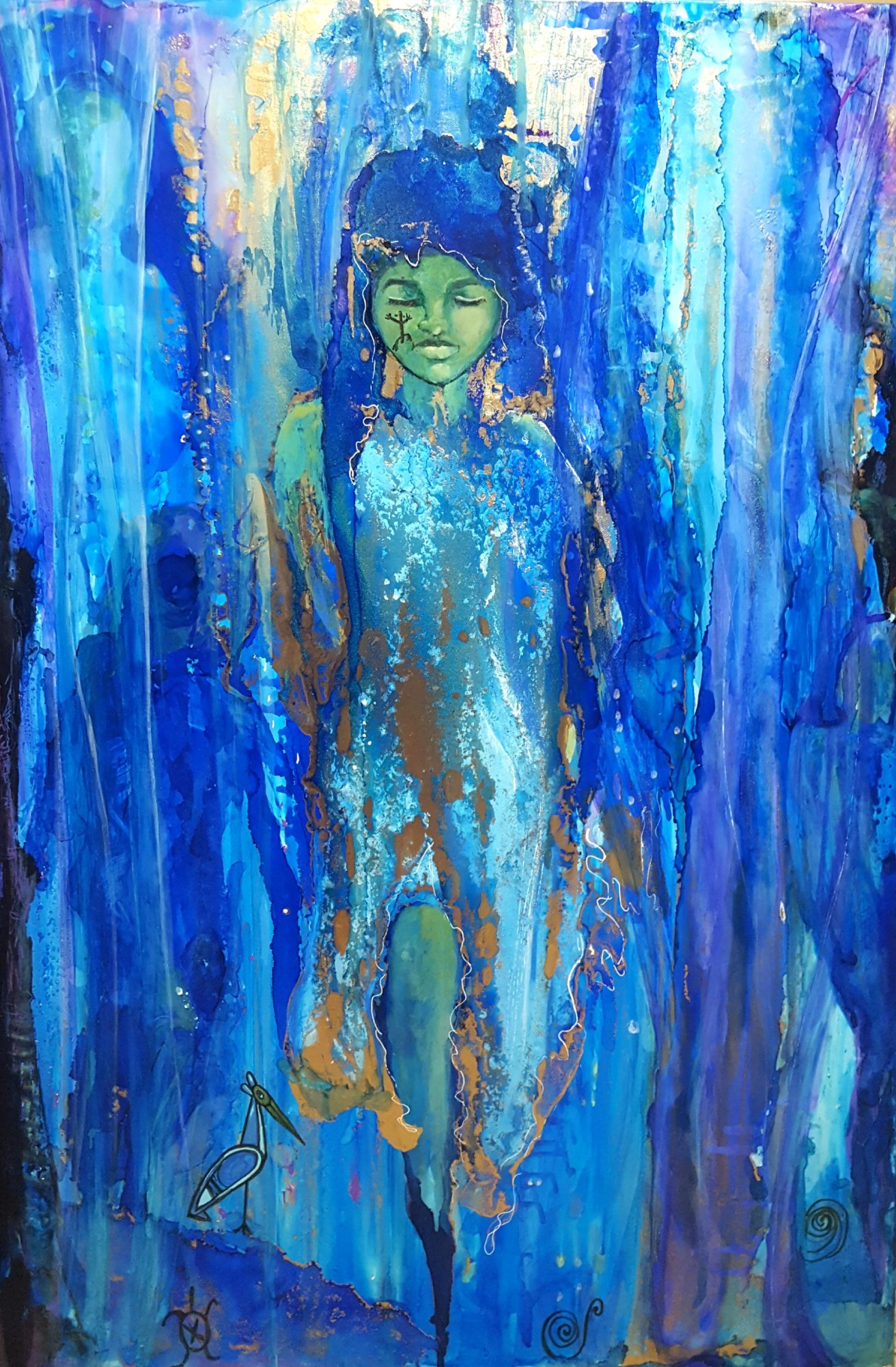 The lustrous metallic gold streaks render an impressionistic flow of one of many picturesque waterfalls in the Island of Puerto Rico. She stands on a threshold of neither here nor there as an expression of my journey from an “incomplete identity” during return migration between Puerto Rico and New York growing up to a realization of a complementary identity and being comfortable in my own skin, my language and peoples.