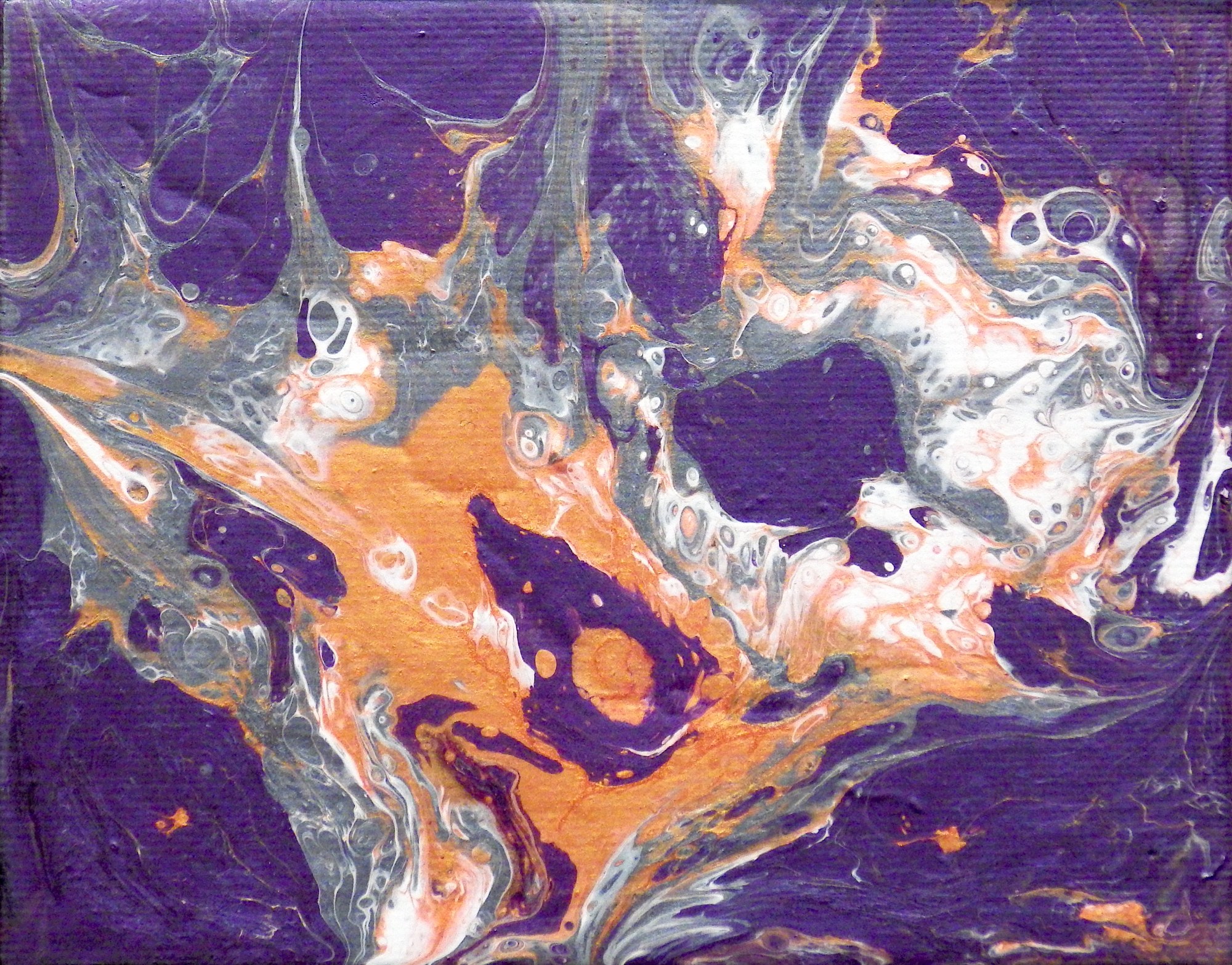Abstract pour painting using purple pearl, white, rose gold, and silver acrylic with pouring medium on 4x5 inch canvas board, 10/2/2020