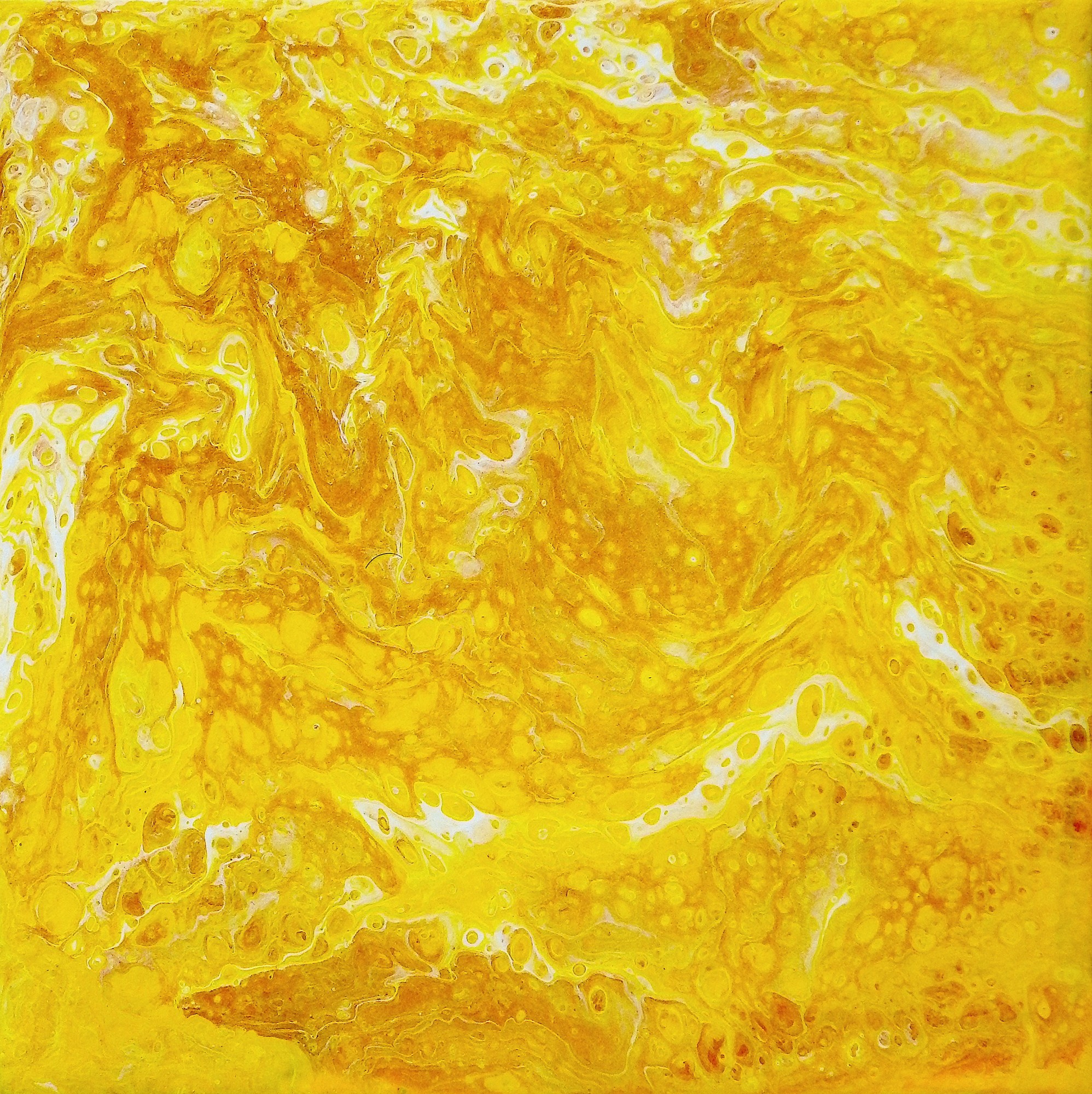 Abstract pour painting using yellow, white, and gold acrylic with pouring medium on 6x6 inch square wood board, 9/19/2020