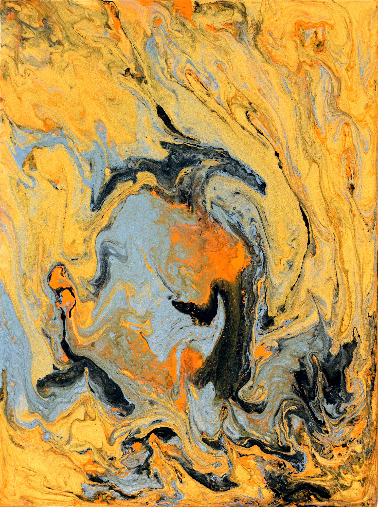 Abstract pour painting using gold, silver, orange, black with pouring medium on 6x8 inch rectangle wood board, 11/6/2020