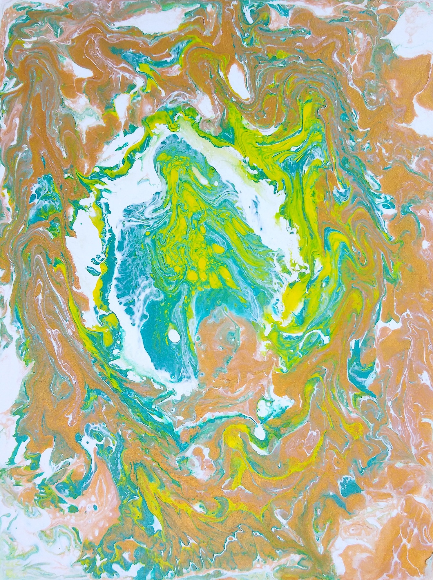 Abstract pour painting using white, gold, teal pearl, and yellow acrylic with pouring medium on 6x8 inch rectangle wood board, 10/24/2020