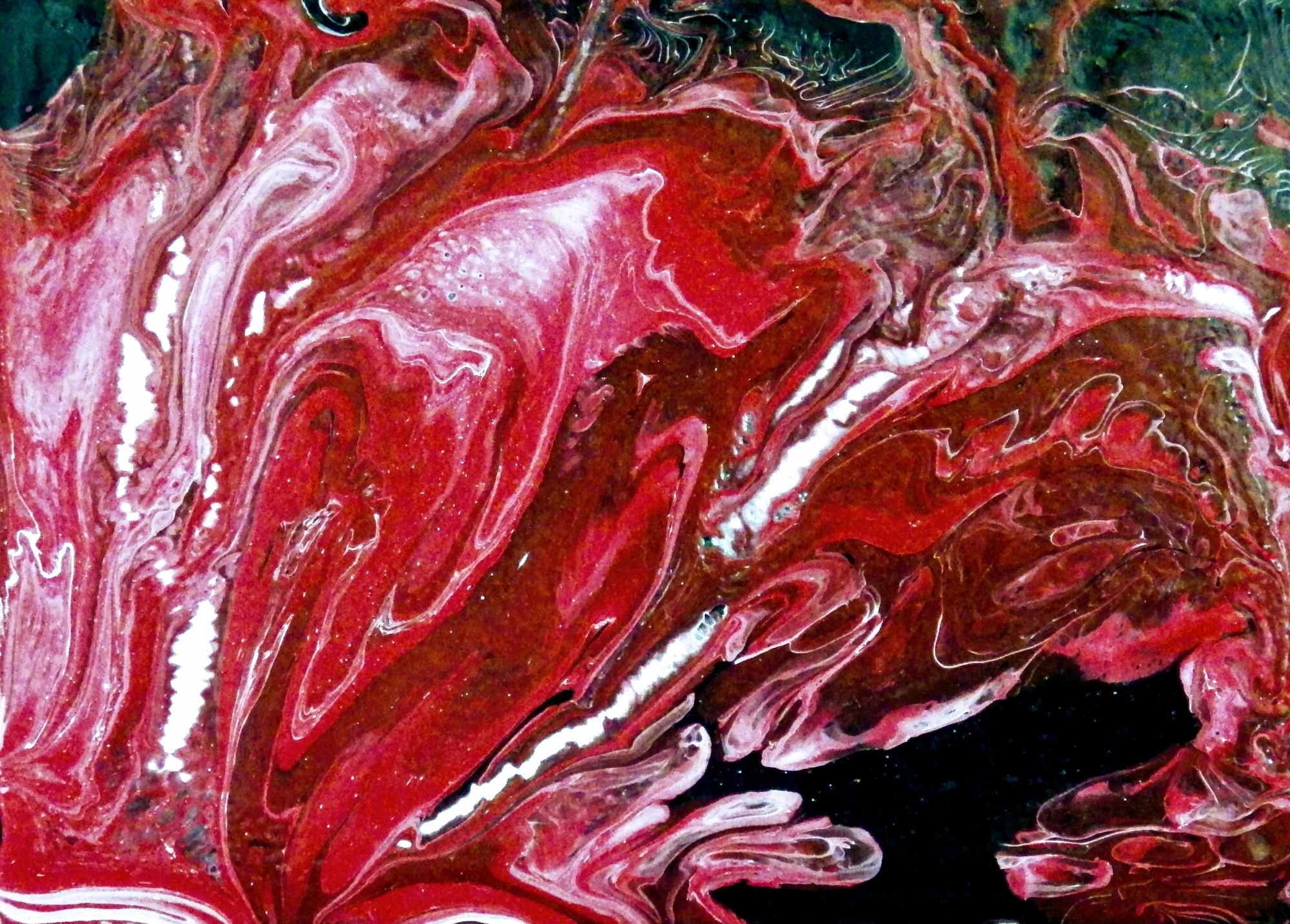 Abstract pour painting using red, black, and white acrylic with pouring medium on 5x7 inch rectangle wood board, c. 11/2017