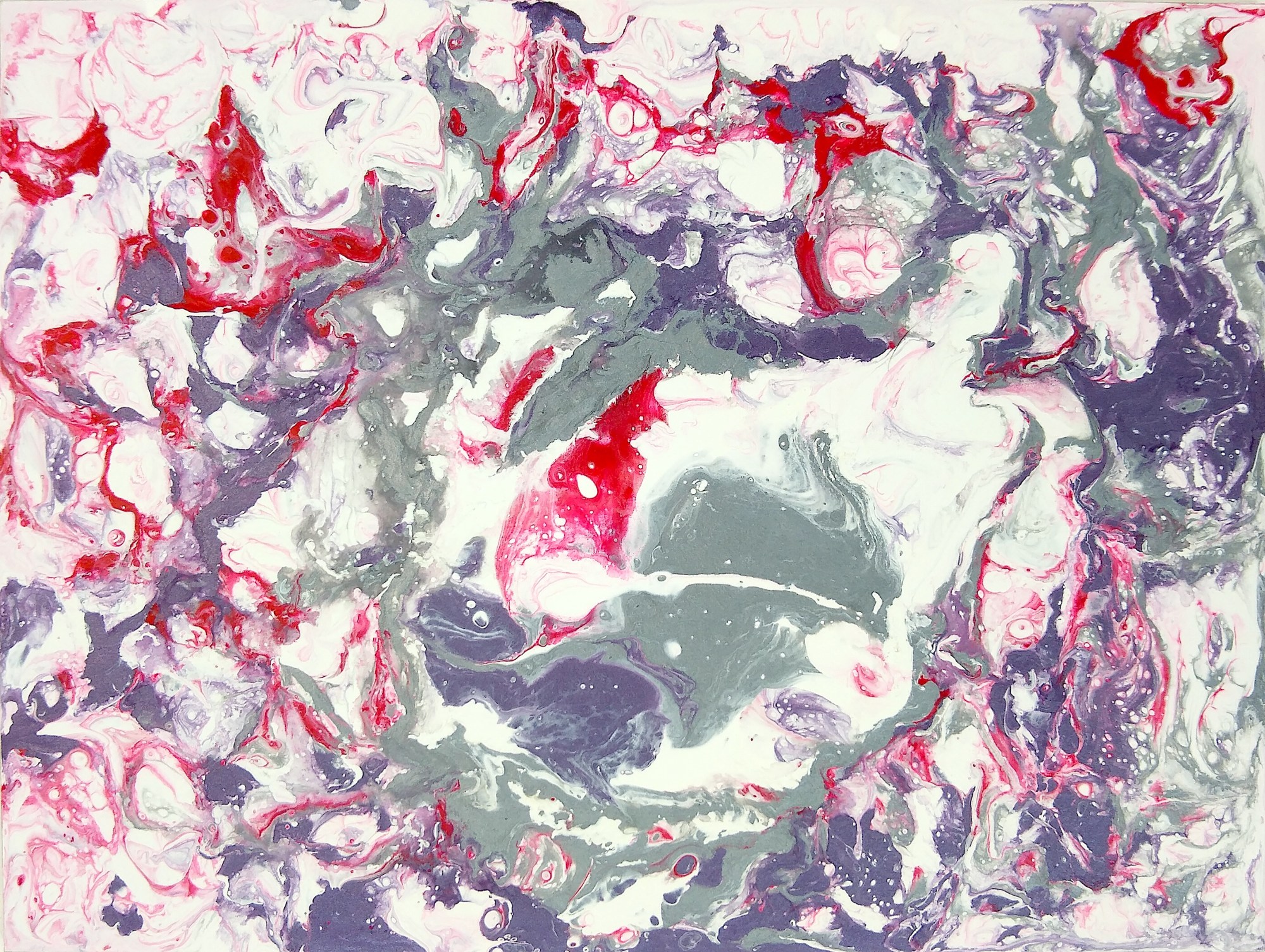 Abstract pour painting using white, silver, red, and purple acrylic with pouring medium on 6x8 inch rectangle wood board, 10/24/2020