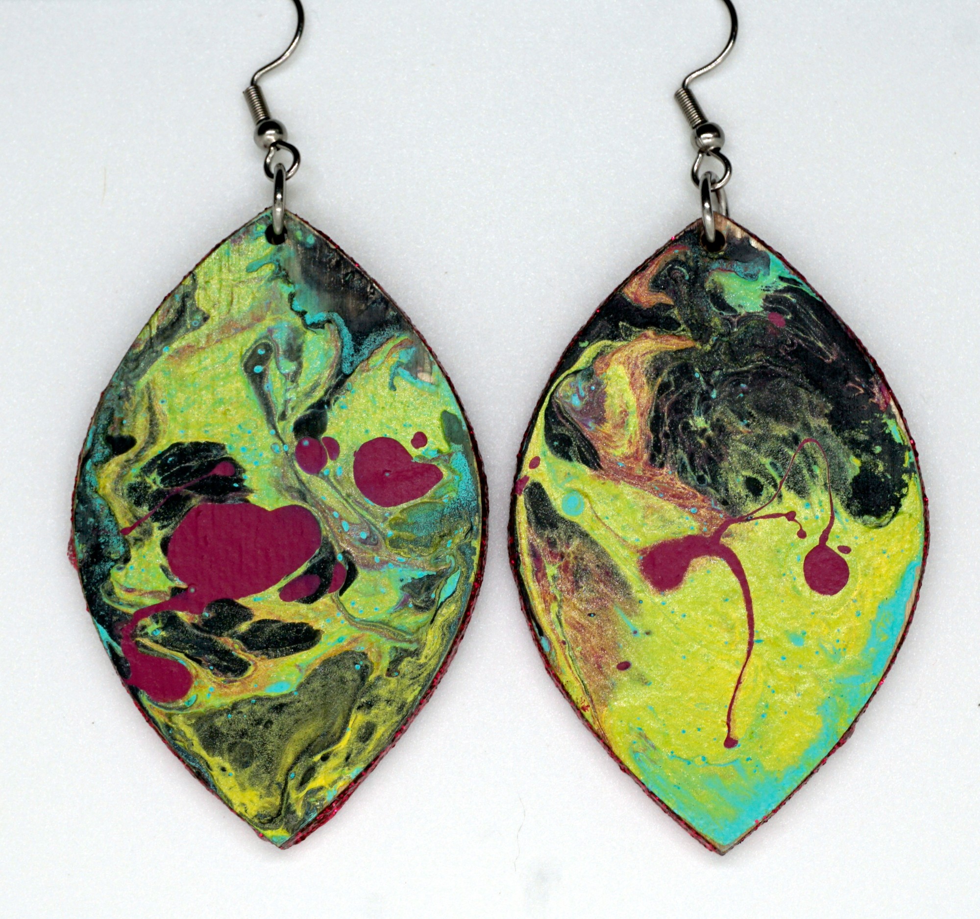 - earrings: acrylic paint on 2.25 x 1.37 inch marquise shaped wood finished with a high gloss varnish; stainless steel hooks⠀