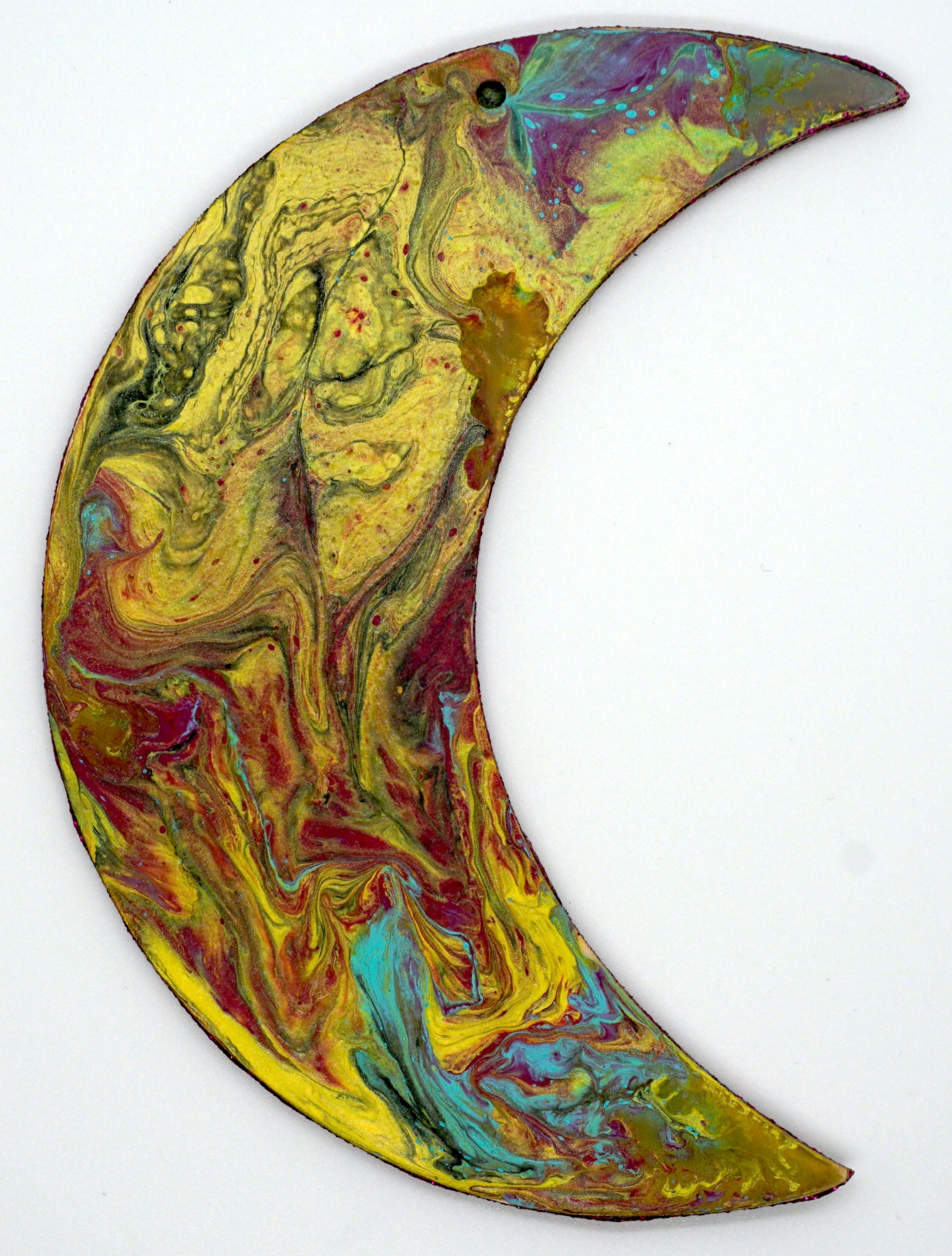 - ornament: acrylic paint on 5 inch crescent moon shaped wood finished with a high gloss varnish