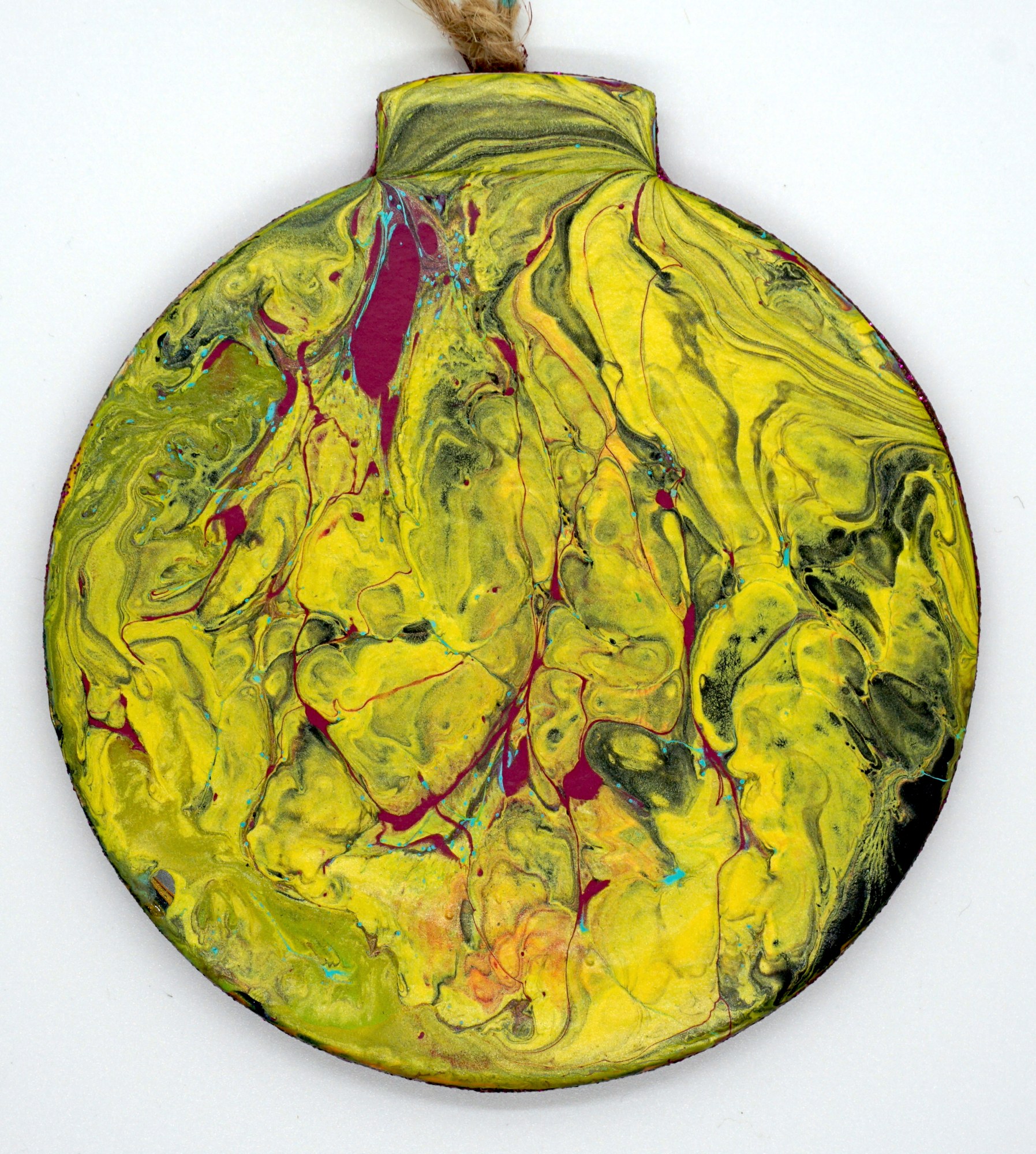 - ornament: acrylic paint on 5 inch round wood finished with a high gloss varnish