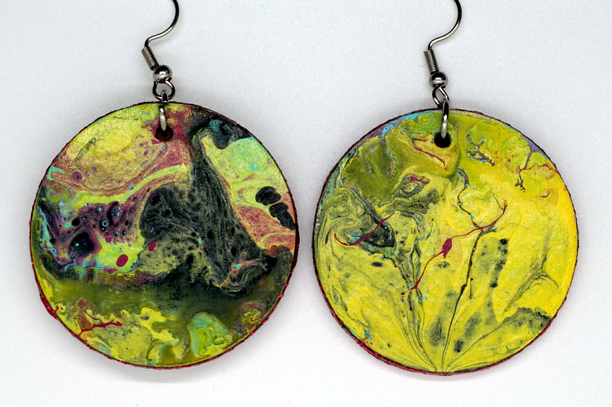 - earrings: acrylic paint on 1.57 inch round wood finished with a high gloss varnish; stainless steel hooks⠀
