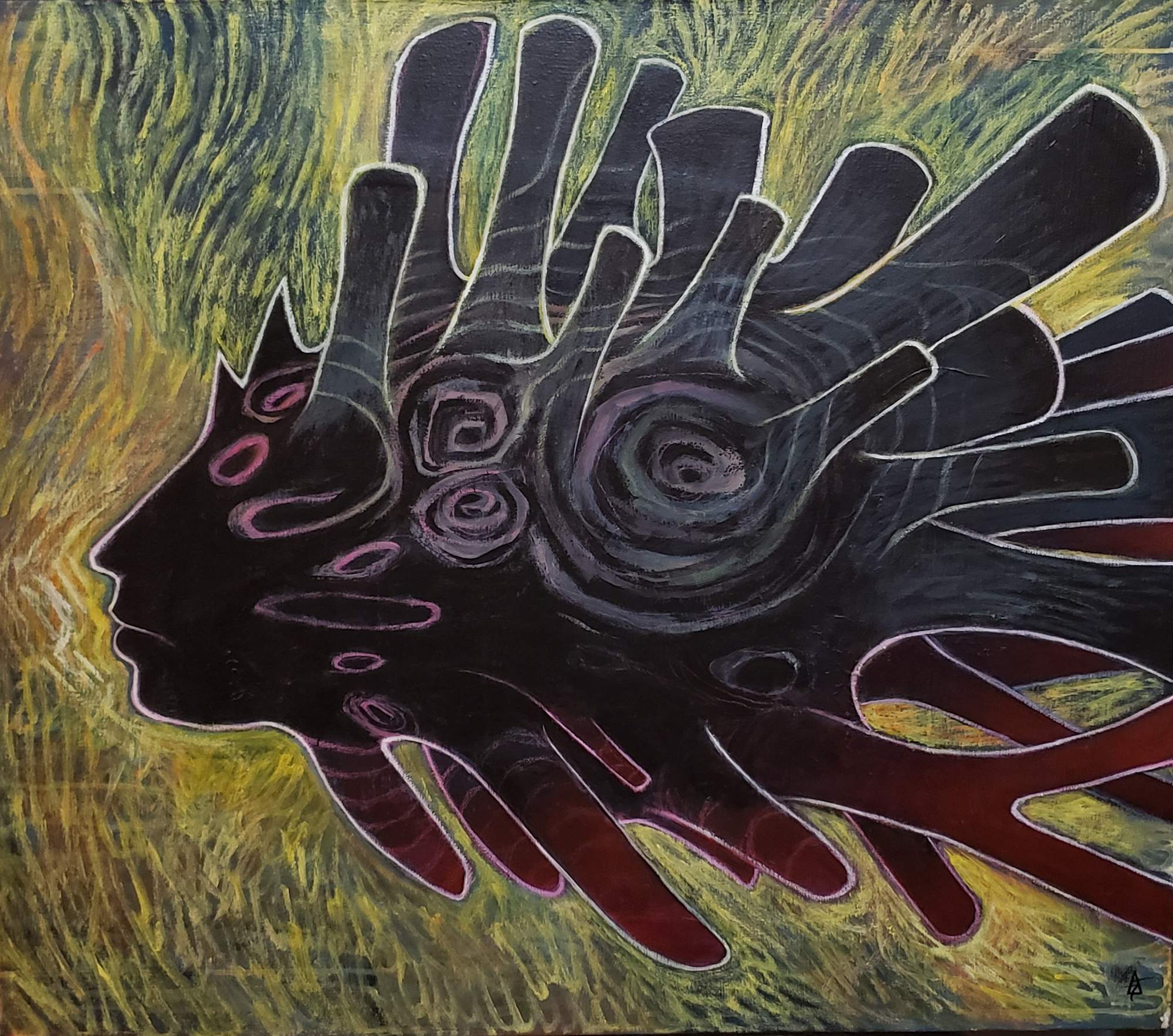 I imagined a creature flowing through the aether of dreamspace. I do not know what their purpose is! This was an automatic painting.