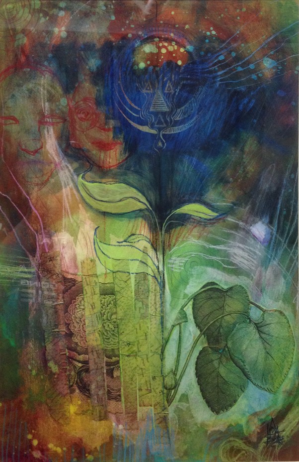 vintage papers, acrylic, colored pencil, oil pastel on paper