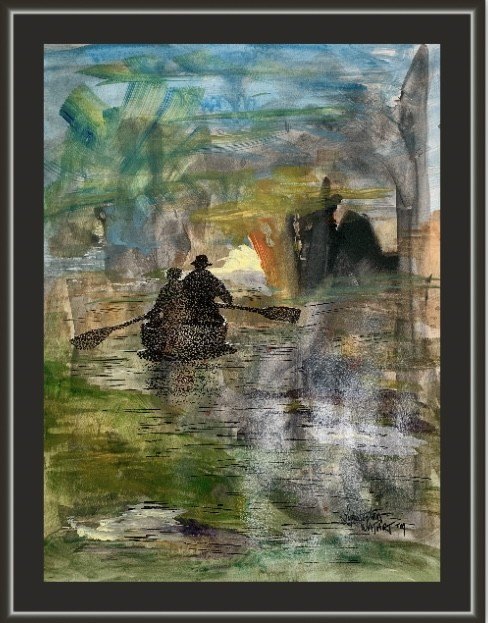 This evocative work captures a serene yet profound journey, with the silhouetted figures rowing trough a reflective, dreamlike landscape rendered in rich layers of green, blue and earthy tones. The fluid brushstrokes and subtle abstraction of the environment create a sense of movement and introspection, inviting the viewers to explore themes of partnership, direction, and the unknown.