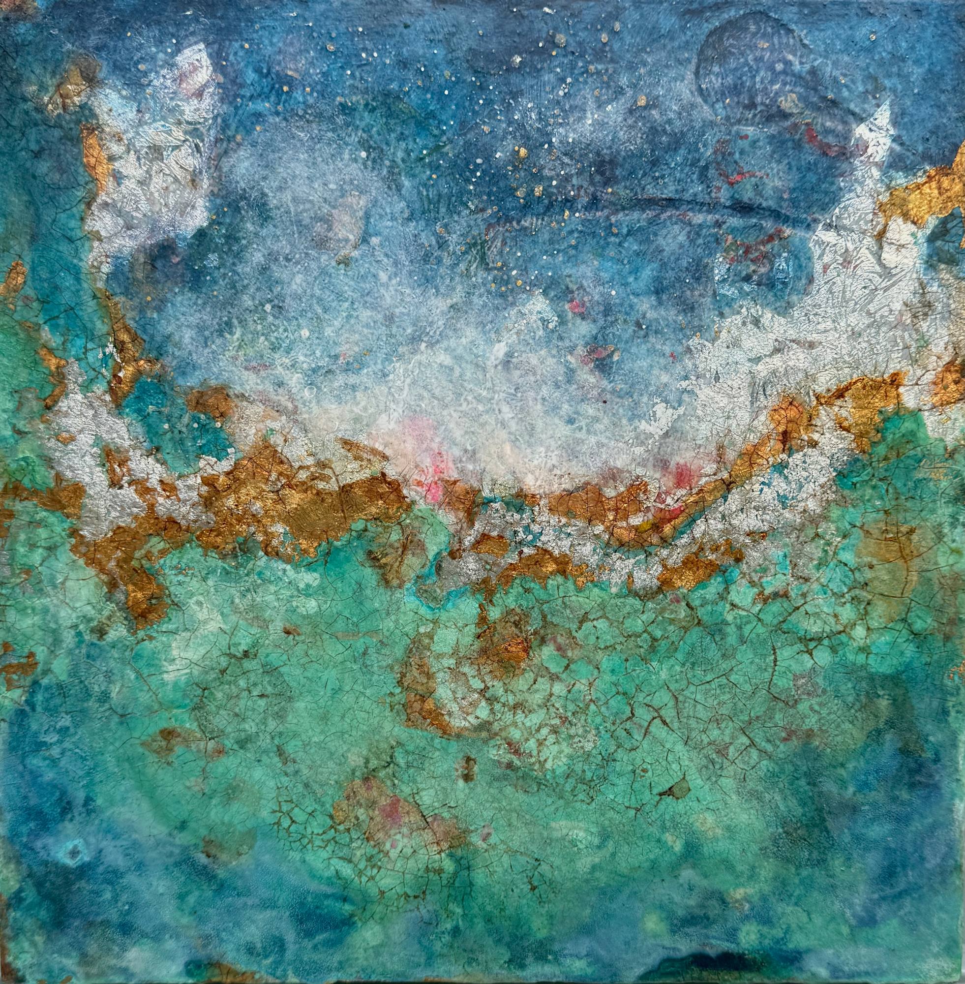 Spray enamel, acrylic, brass & aluminum leaf, patina, oil on wood panel