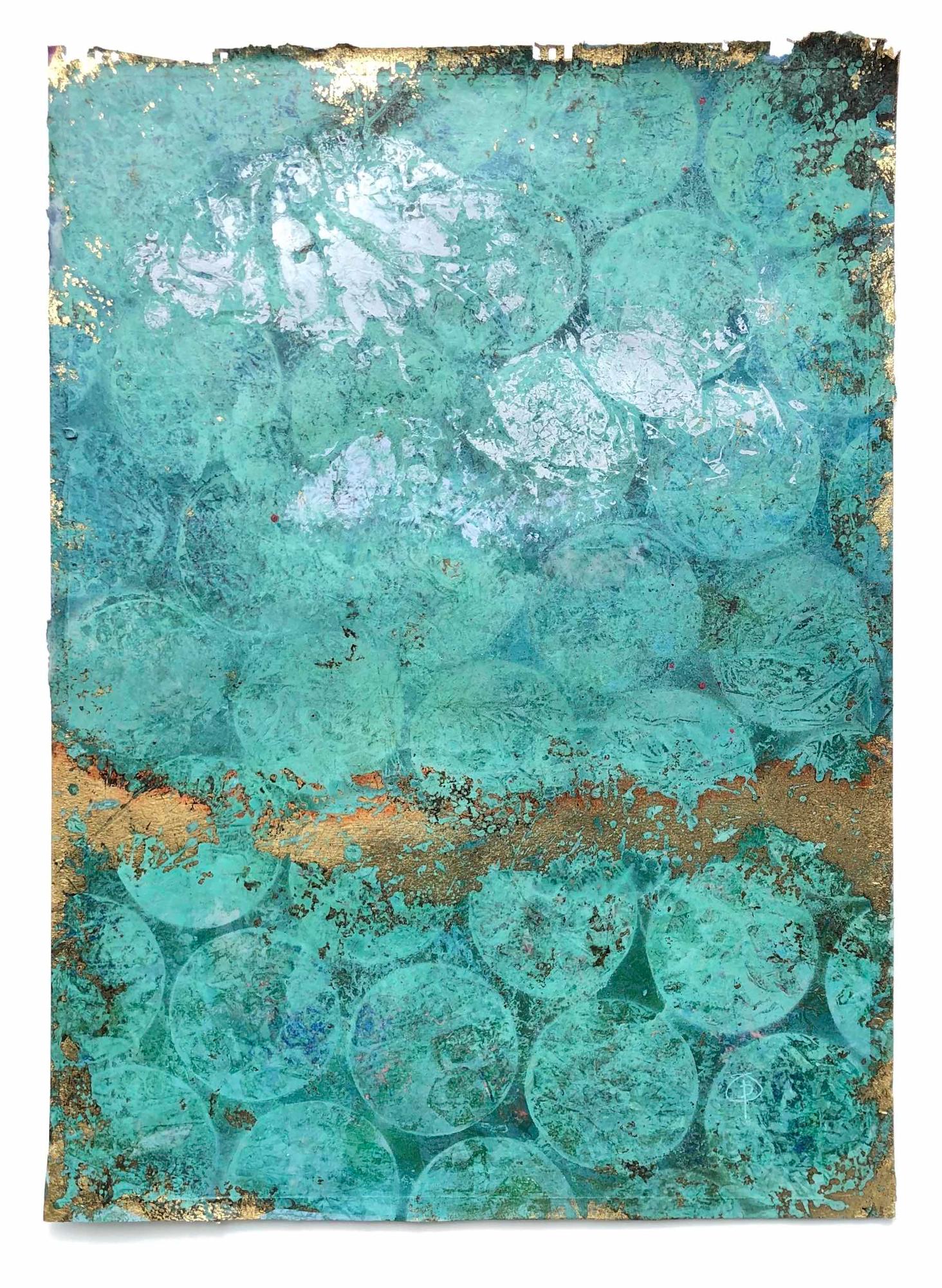 Spray paint, oil, composition gold leaf, patina, spray paint transfer on paper