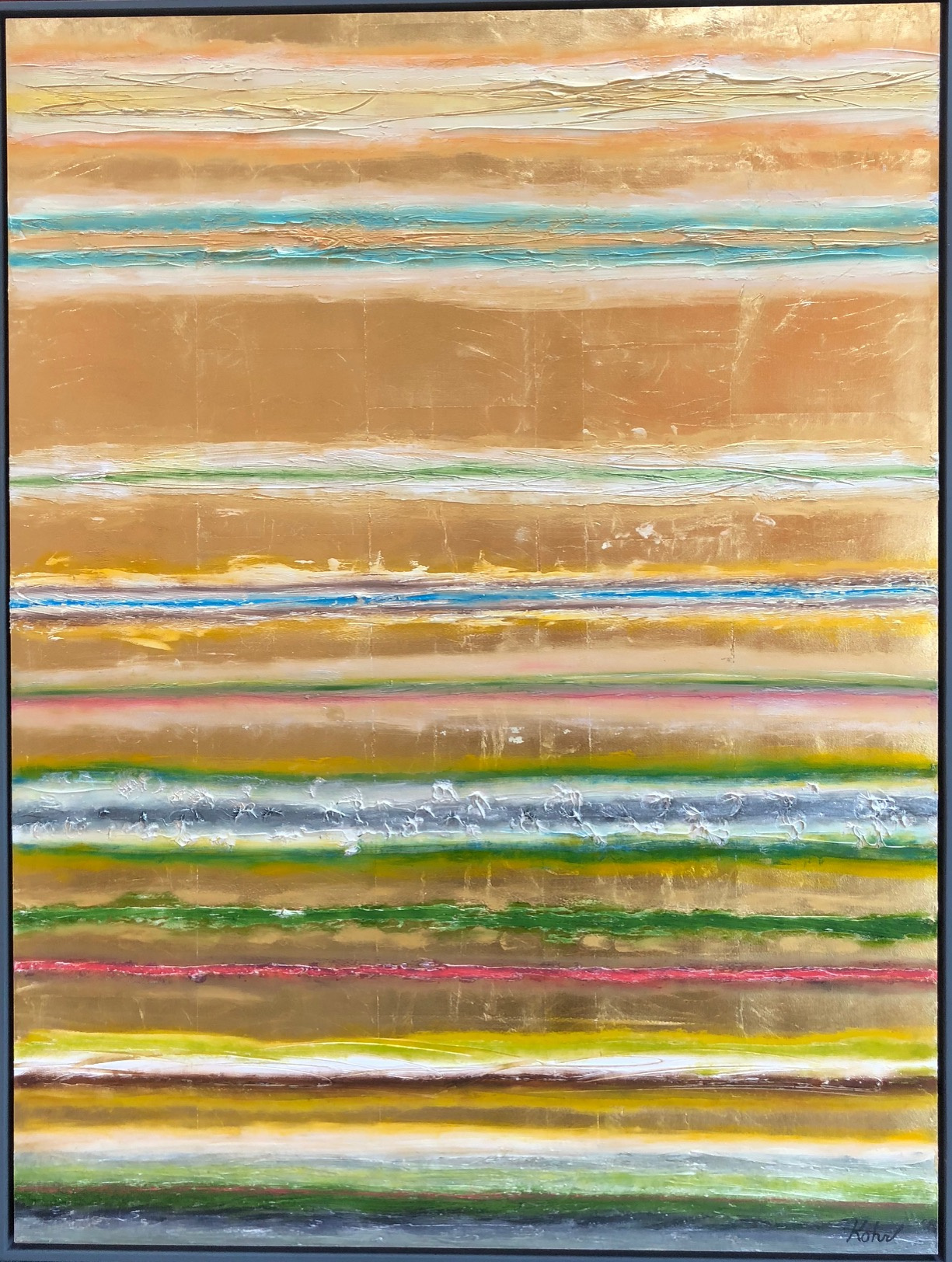 Livestock marker, gold leaf, oil stick on wood panel