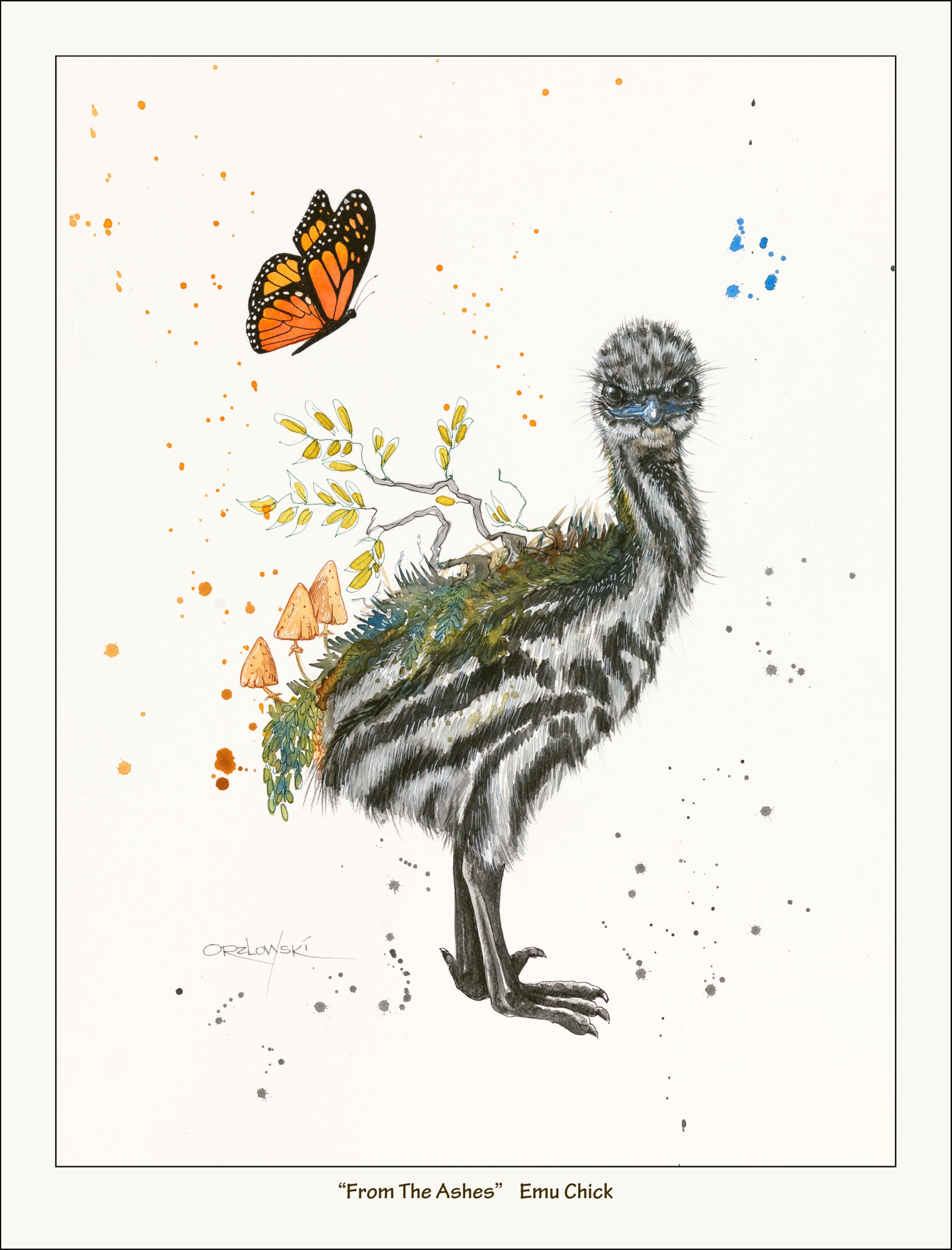 I have decided to paint the native Australian wildlife in ash colour tones to represent the bleak burnt ground that is left behind long after the fires have passed, with the addition of a splash of colourful sprouting flora representing new beginnings and butterfly, that represents new life & transformation.