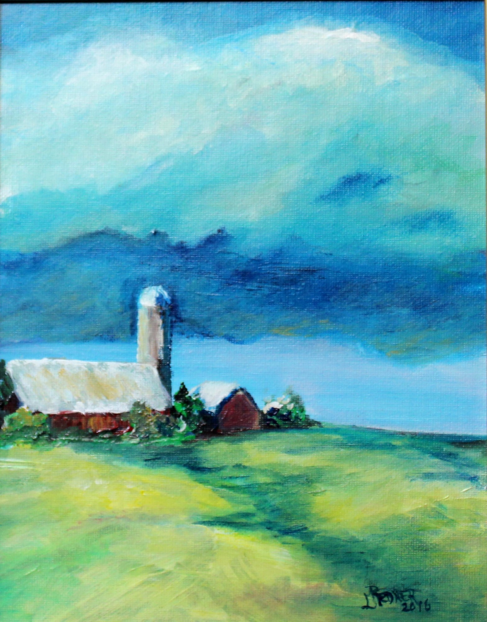 Painted from my memory of a farm I saw north of Clinton. A storm was coming in and the colors were so vivid. So I came home and painted it as I remembered.