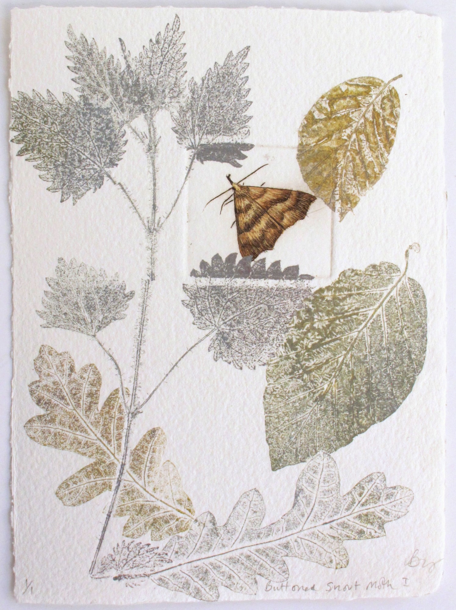 The moth is a drypoint print tinted with watercolour, and the hedgerow plants are monoprint - printed directly from the actual plants.