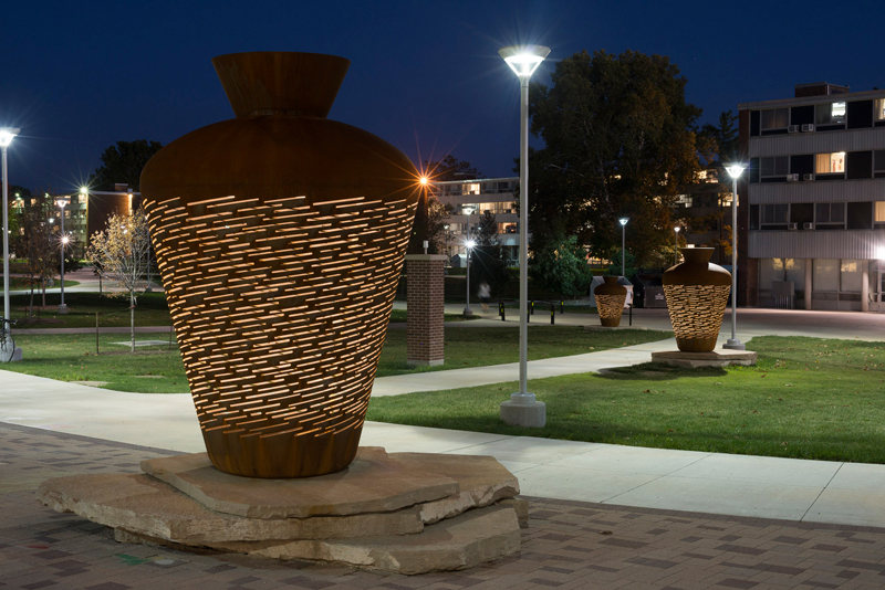 The unusual path of Wassaja’s life began when he was taken as a young child from his Yavapai Apache family in the Southwest in 1860. He was sold to an Italian photographer who raised him as a son. He entered UIUC when he was 14 years old and became a medical doctor, fighting for Native American rights. In his old age he returned to his people. “The Long Way Home,” tells this story with stone from the land of Wassaja’s birth and sculptures in the form of a Yavapai basket.