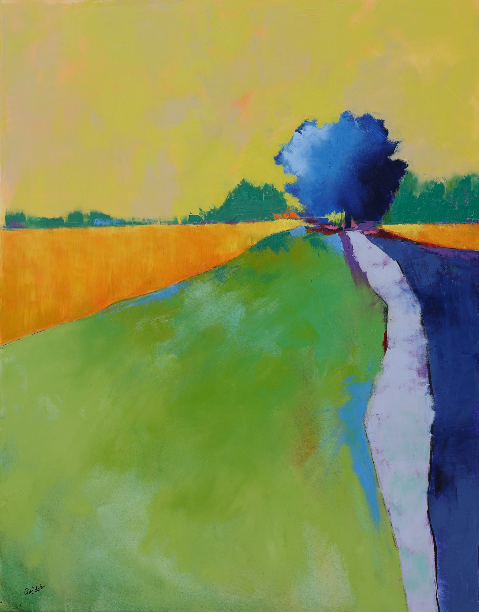 This painting was inspired by a beauty advertisement in a magazine from the 1950s which had nothing to do with the landscape. I enjoy the bold colors, and geometric, large shapes.