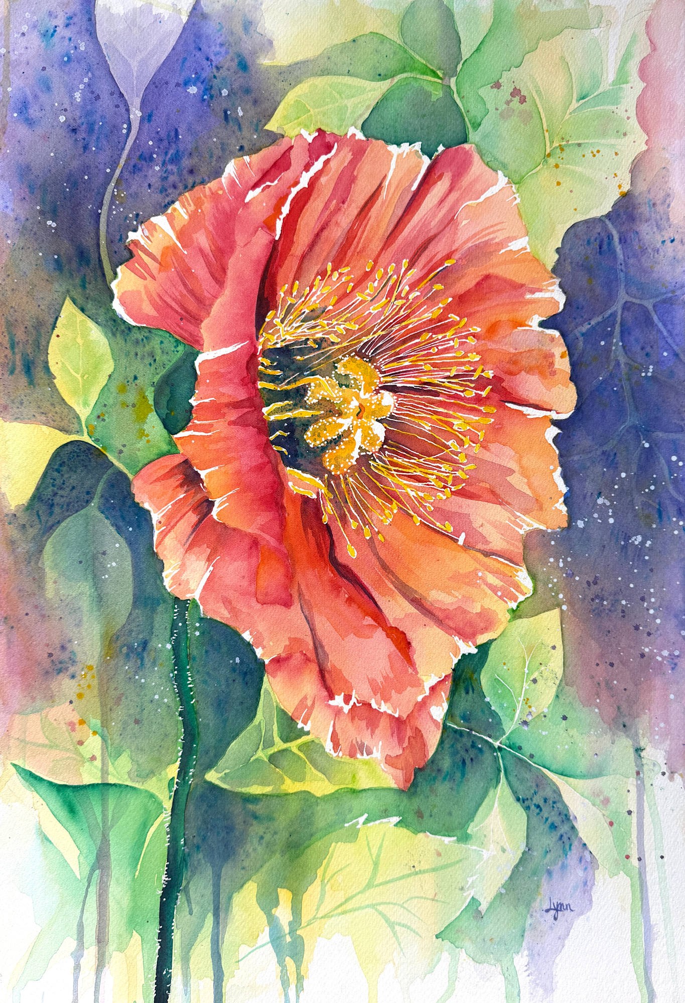 This piece is painted using watercolor and Brusho Watercolor Crystals in shades of pink, orange, yellow, blue and green. My own reference photos from a poppy garden in Billings, MT.