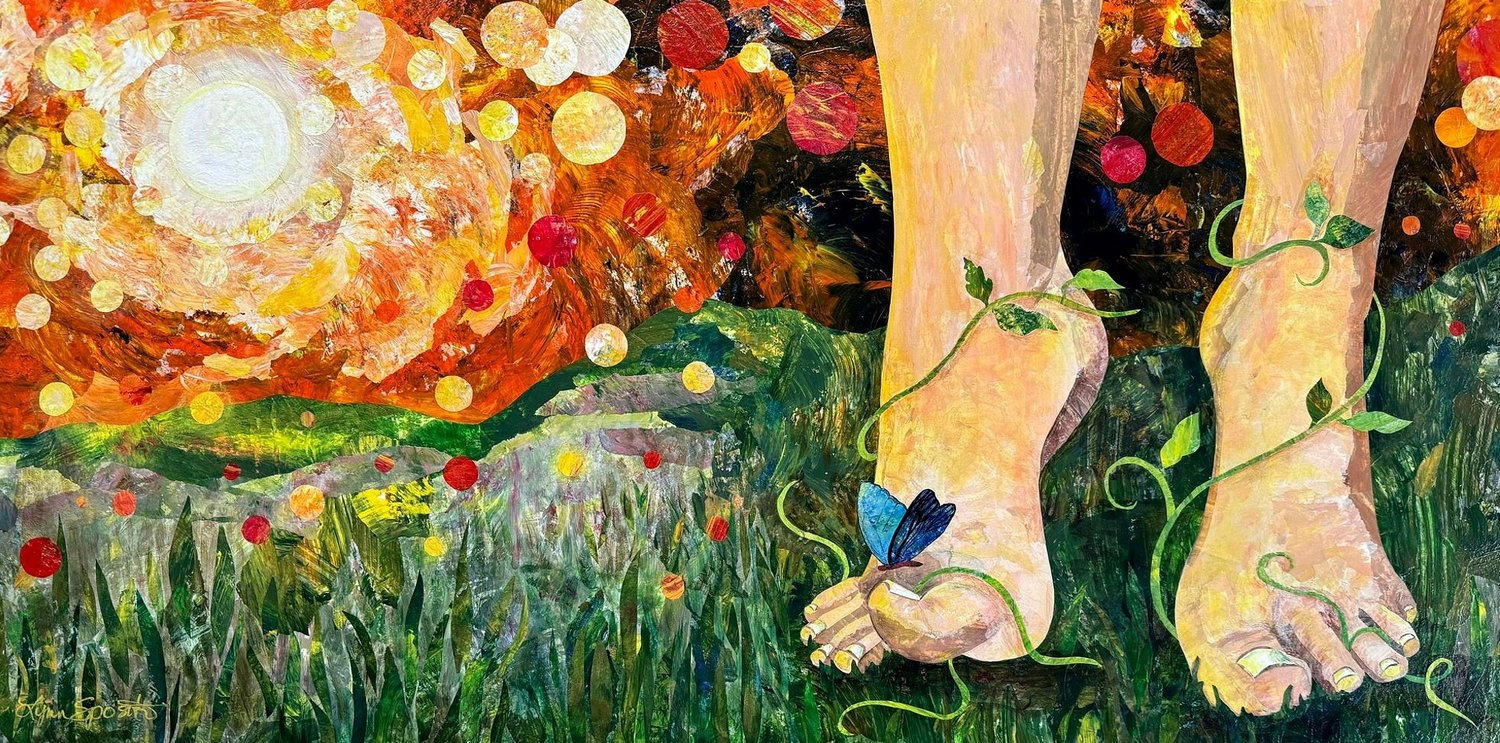 - Subject Matter: landscape with feet being grounded and entwined by vines, sunlight highlighted in orbs