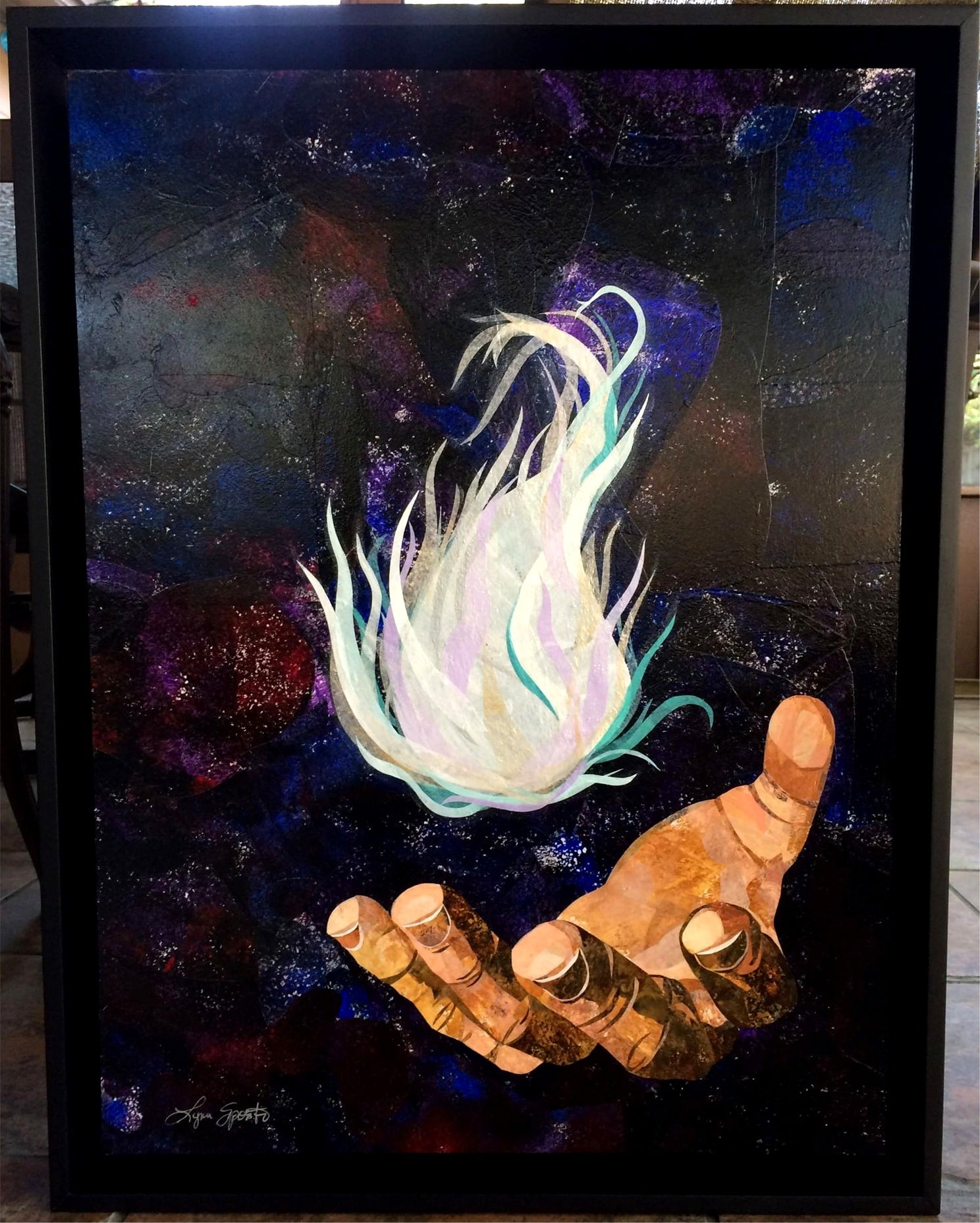 A personal story close to my heart of a young man so consumed by his earthly chains that he took his own life. This piece serves to honor his memory and celebrate his eternal spirit~ The soft teal and gentle purple represent the national colors for suicide awareness. He is forever cradled in our creator's hand.