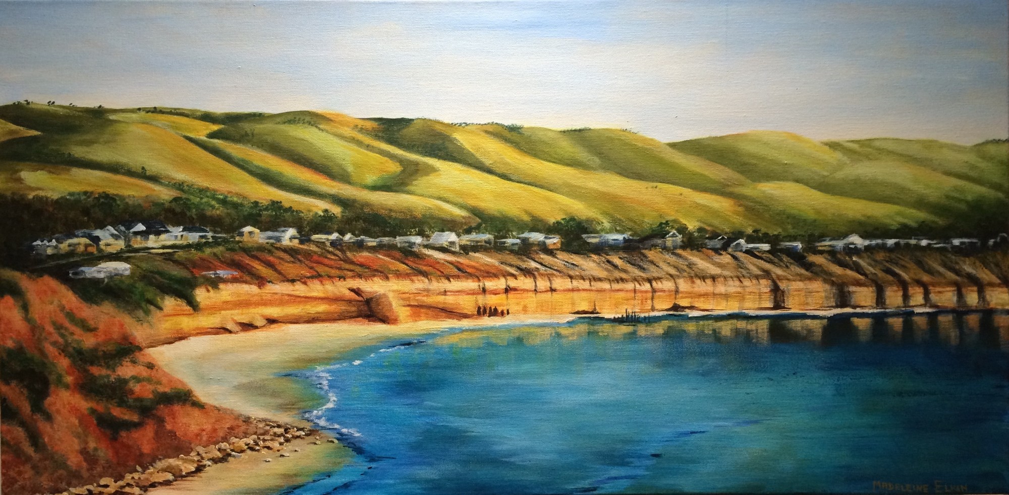 A local painting looking south to Port Willunga Beach catching the afternoon glow of the sun. You can just see the iconic Star of Greece ship wreck on the other side of the bay.