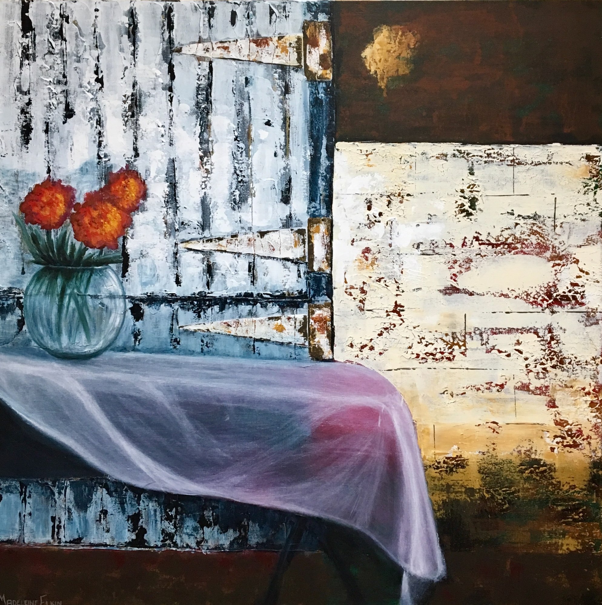 The beauty of old decaying walls and paint work contrasted against the fresh new flowers and sheer tablecloth.