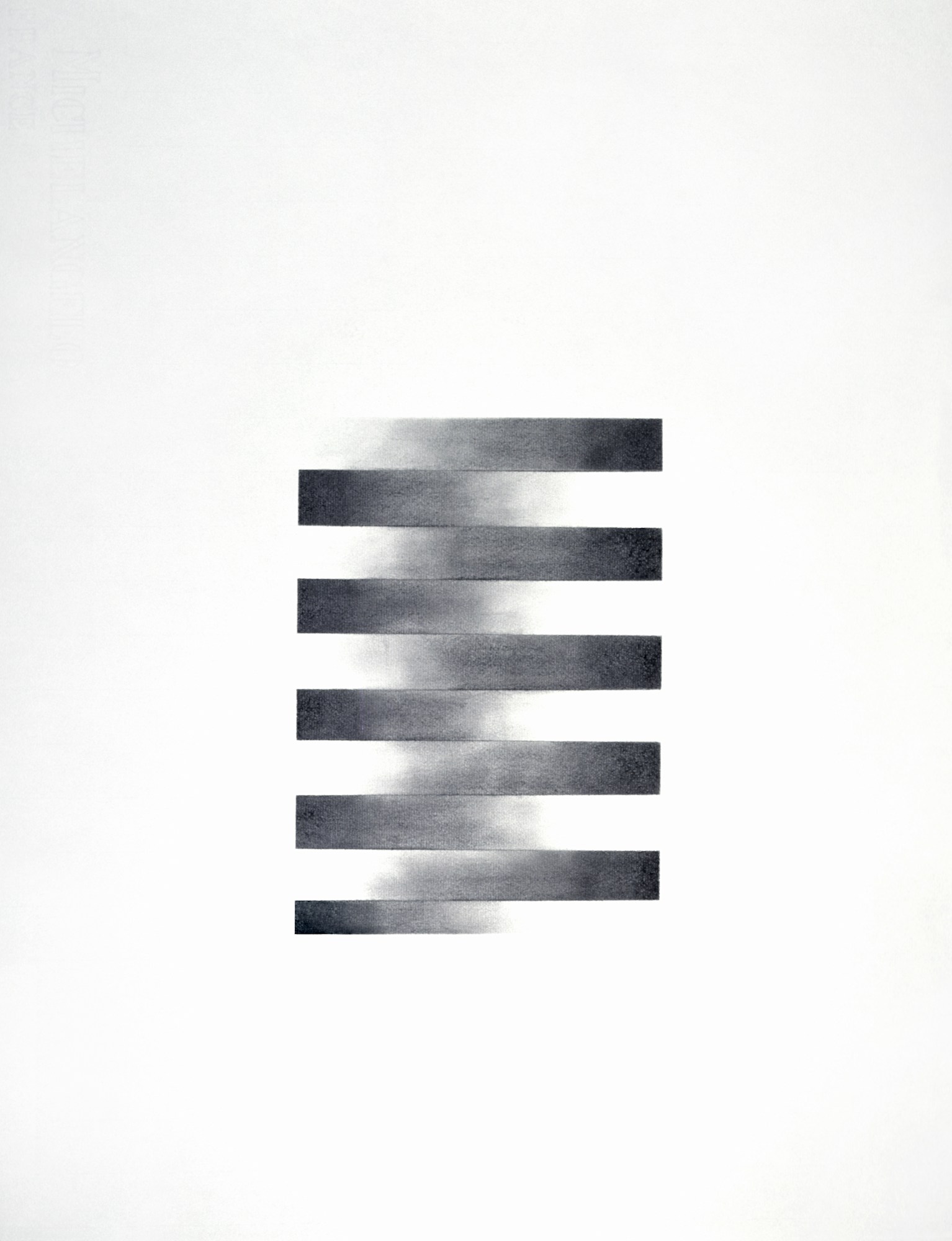 “Dark Left – Dark Right” was a series of drawings, but it was also a meditative event. Working on Fabriano Rembrandt paper, I carefully measured each sheet, and then starting at the bottom, lay down drafting tape before gently putting in soft graphite. I used the heel of my hand, or a piece of silk shirt cuff, to rub the graphite into the paper, taking care not to rub it so hard that it became glossy. I was pleased with the rhythm and musicality of the finished drawings, this variation on a theme.