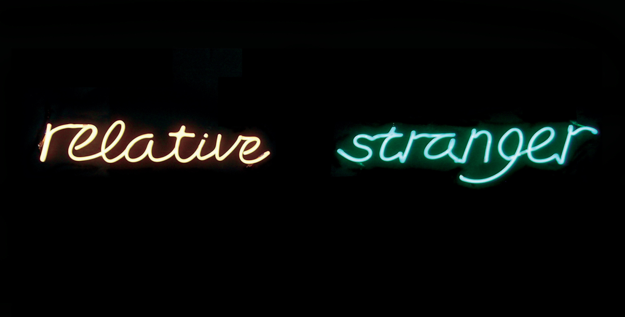 In another of her neon pieces, “Relative Stranger,” the oxymoron carries an additional level of metaphor: the word “relative” is warm in color and “stranger” is cold, but these roles can exchange places psychologically; sometimes your relatives are strangers, or you may feel closer to strangers than your relatives.