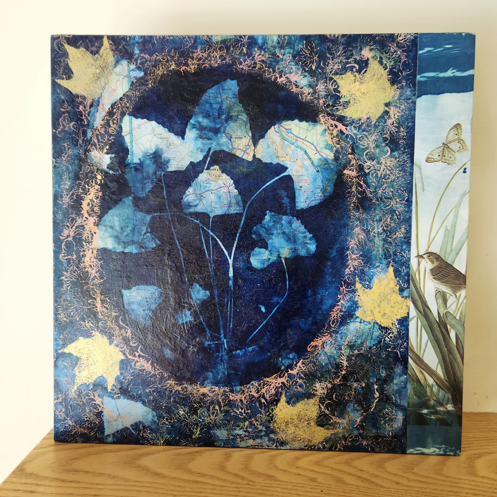 Cyanotype created on a map of Rhode Island; depicts Violets, the state's flower. The cyanotype is embellished with Red Maple leaves, the state's tree, and a page of Audubon's Birds of America, altered with the cyanotype process; depicts a Sea Sparrow. The work is mounted on a cradled board and finished with cold wax.