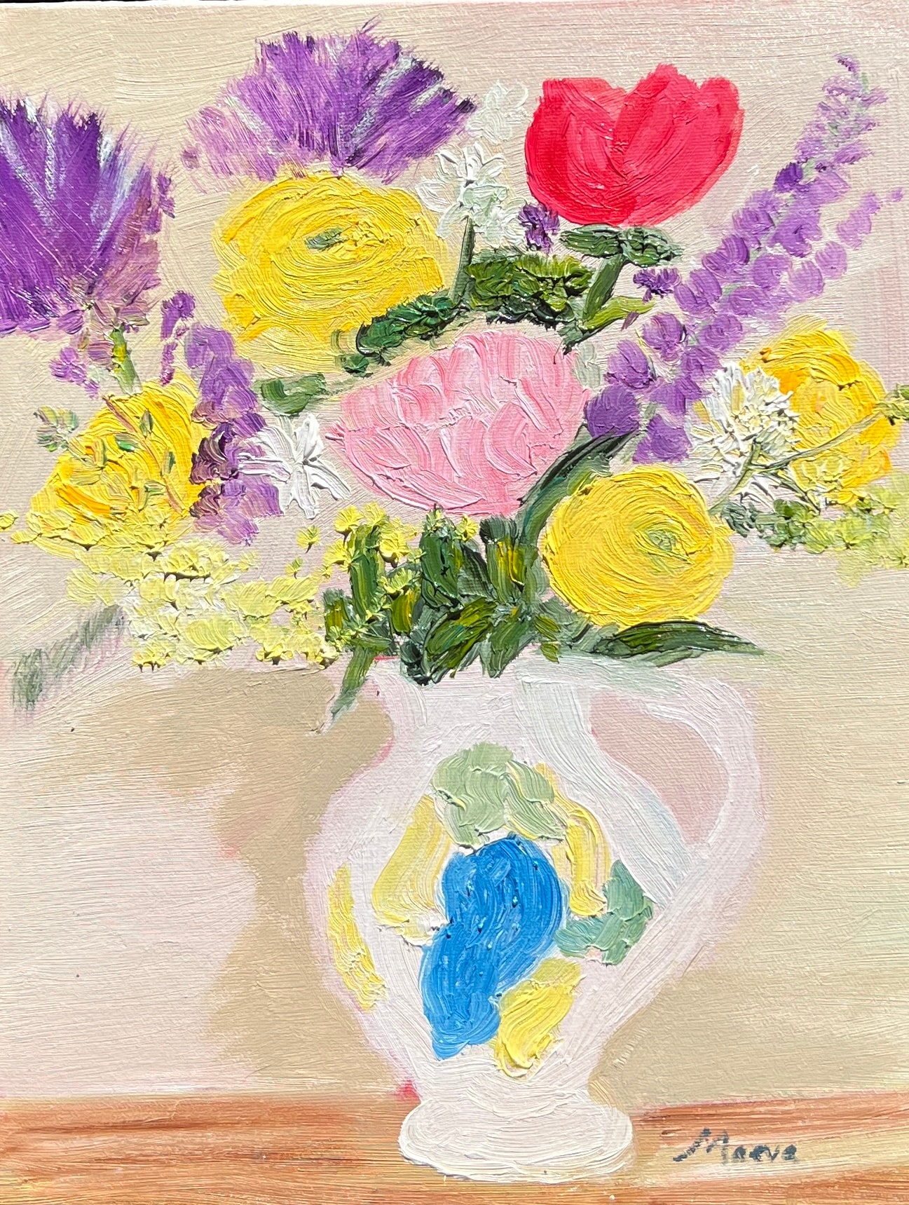 I don’t paint still life all that often but was inspired by a vase of flowers my daughter gifted me for my birthday. She ordered them from a grower on Mayne Island where I live. Thank you for your patronage.