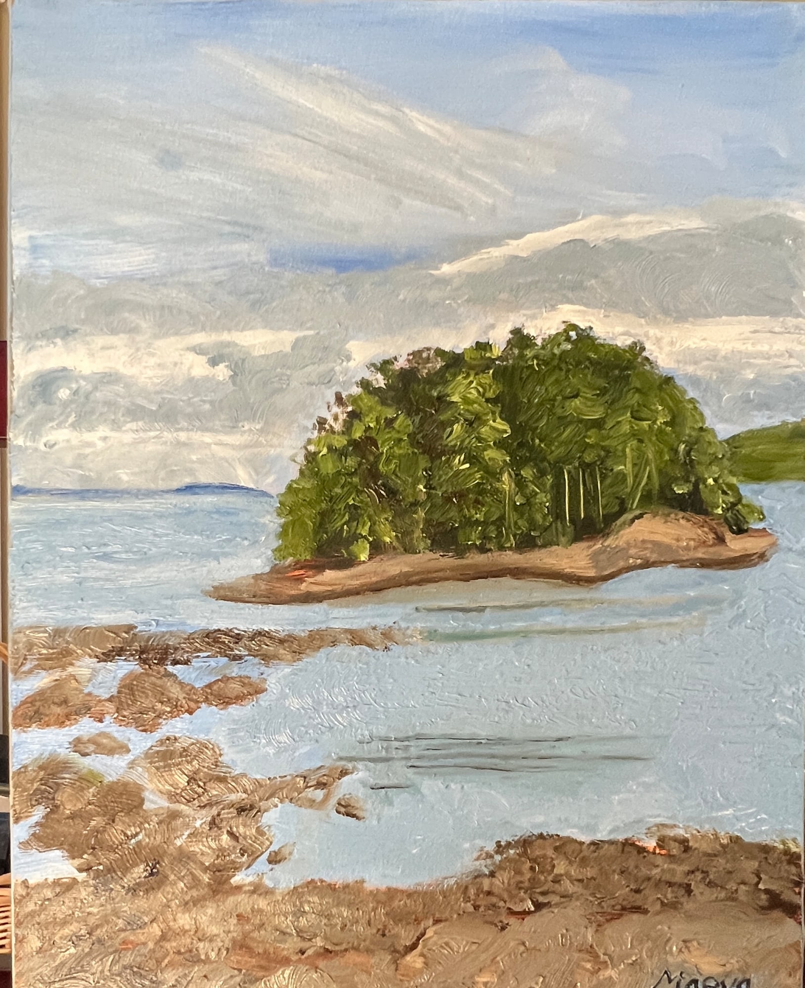 The painting was inspired by Georgeson Island, an uninhabited Island off of Mayne Island where we reside. We often sit gazing at the island and wondering what stories it has to tell. Thank you for your patronage.