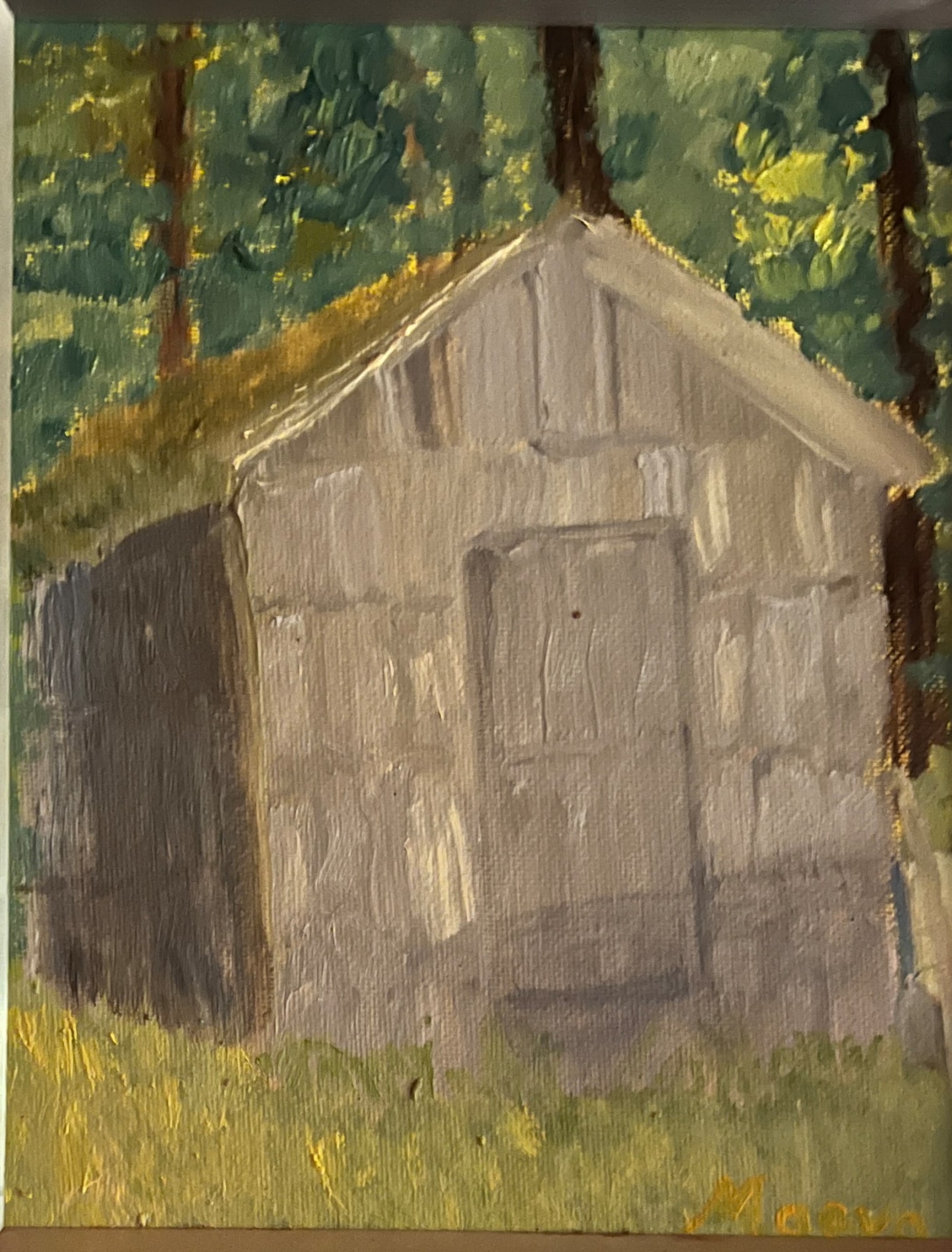 This a plein air painting of a rustic shed . I was inspired by the rustic structure.