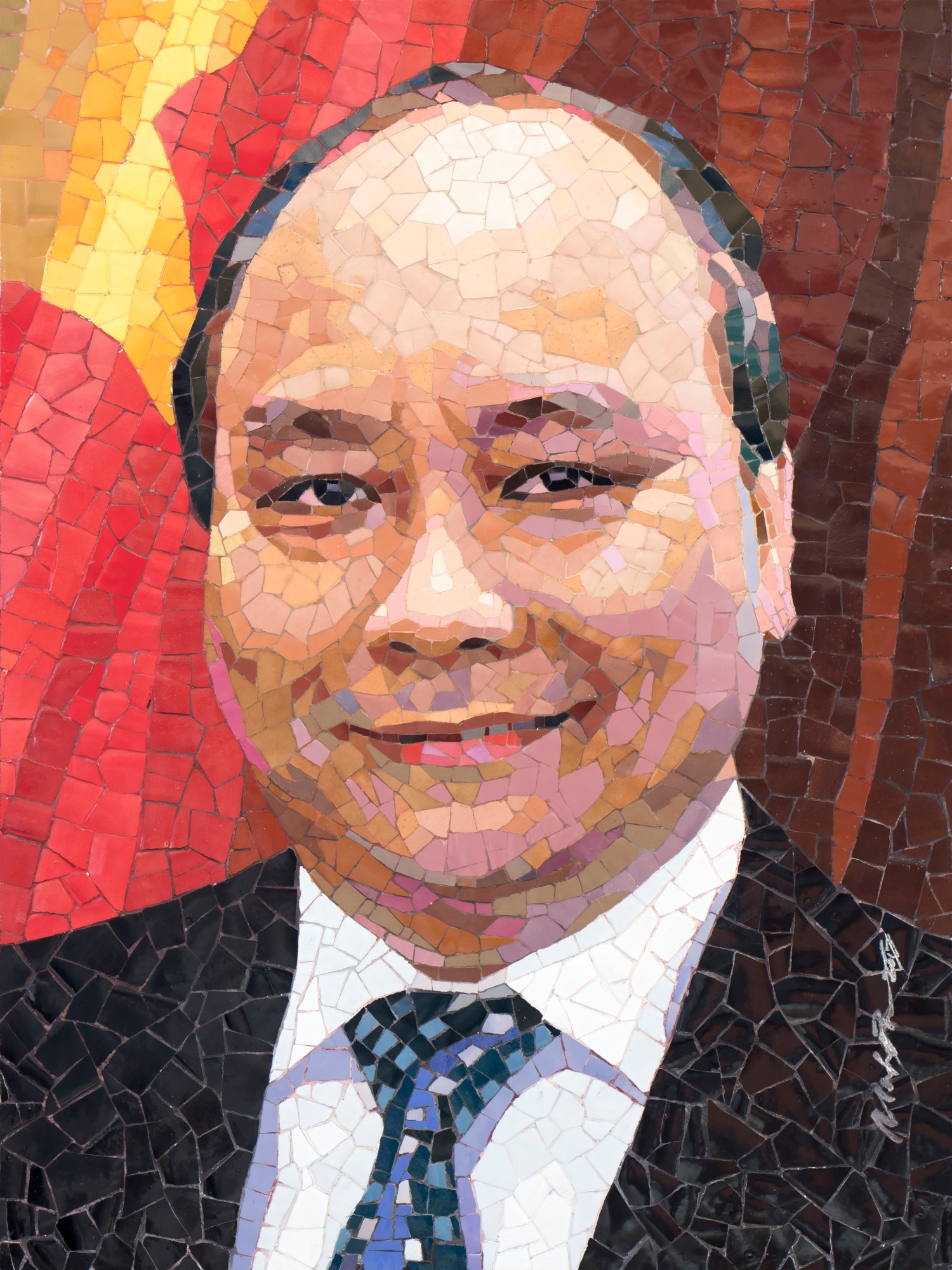 Portrait of Vietnamese Prime Minister Nguyen Xuan Phuc, 2017 - This one-of-a-kind mosaic portrait, a special gift from Dong Nai province to Vietnamese leaders in 2017, was created by artist Mai Nhon. The portrait beautifully showcases the artistry of Bien Hoa ceramics. Each meticulously placed ceramic fragment, carefully chosen for its unique color and tone, contributes to an exceptional and irreplaceable work of art. Contact us to own a museum-quality art print - a perfect gift or addition to your workspace!