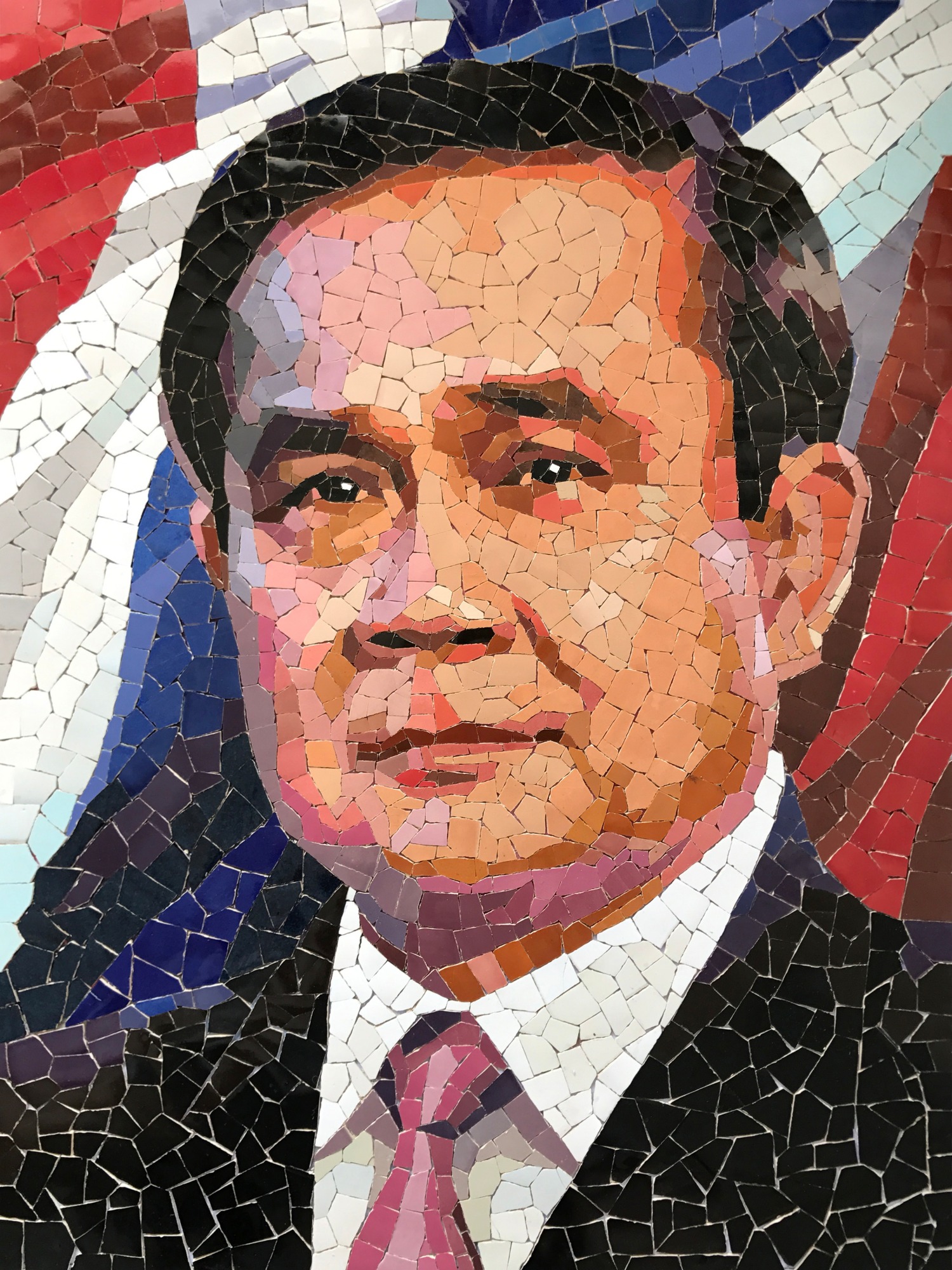 "Portrait of Thai Prime Minister Prayut Chan-o-cha, 2017 - A distinguished gift from the Vietnamese Government to Leaders of the APEC economies in 2017, this striking mosaic portrait captures the presence of Prime Minister Prayut. Created by renowned artist Mai Nhon, the portrait is a testament to the artistry of Bien Hoa ceramics. Countless meticulously arranged ceramic pieces, each with its unique color and tone, come together to form a truly unique and powerful work of art.