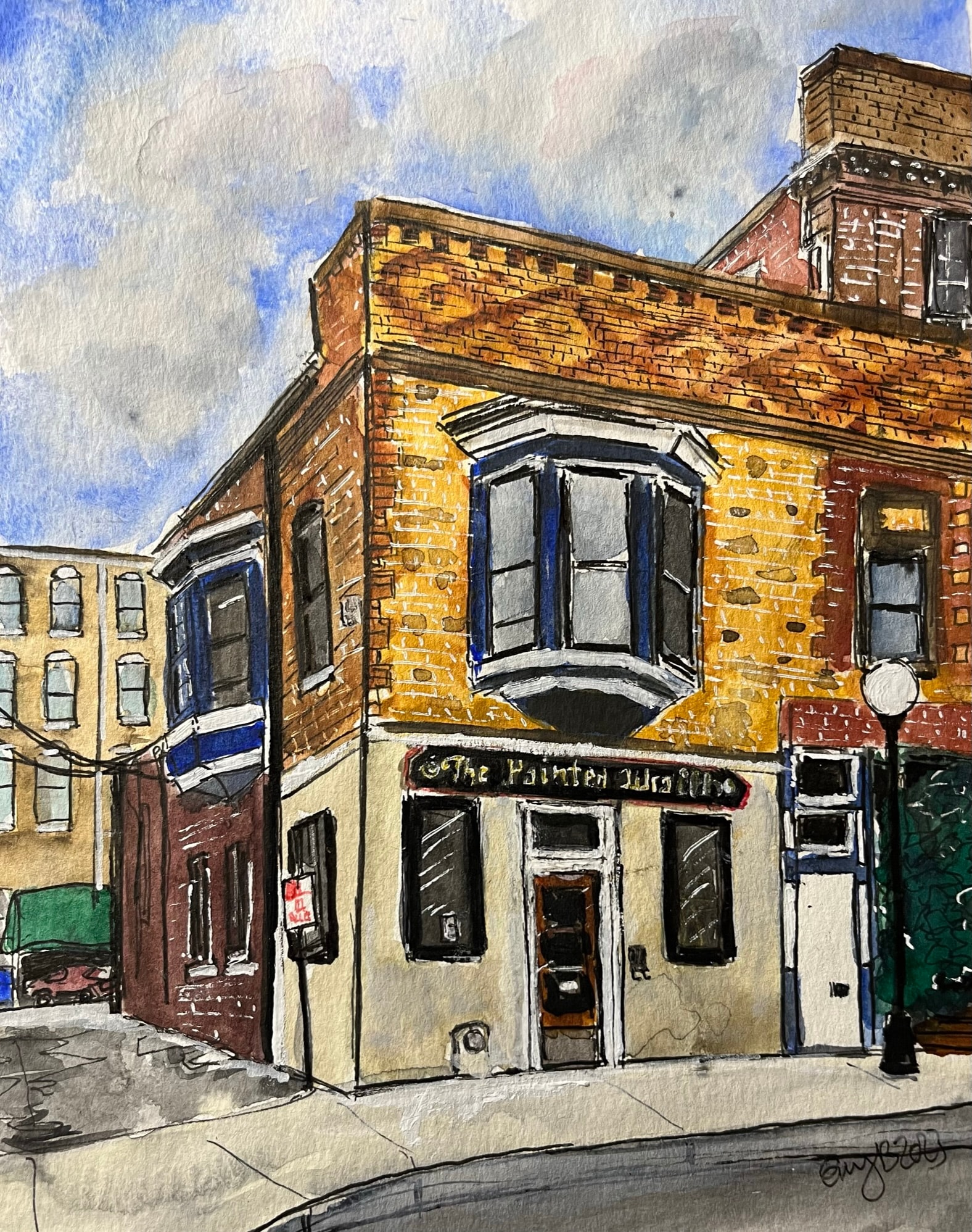 Framed Water color and ink painting of The Painted Wrath Curiosity Shoppe in downtown Bloomington, IL