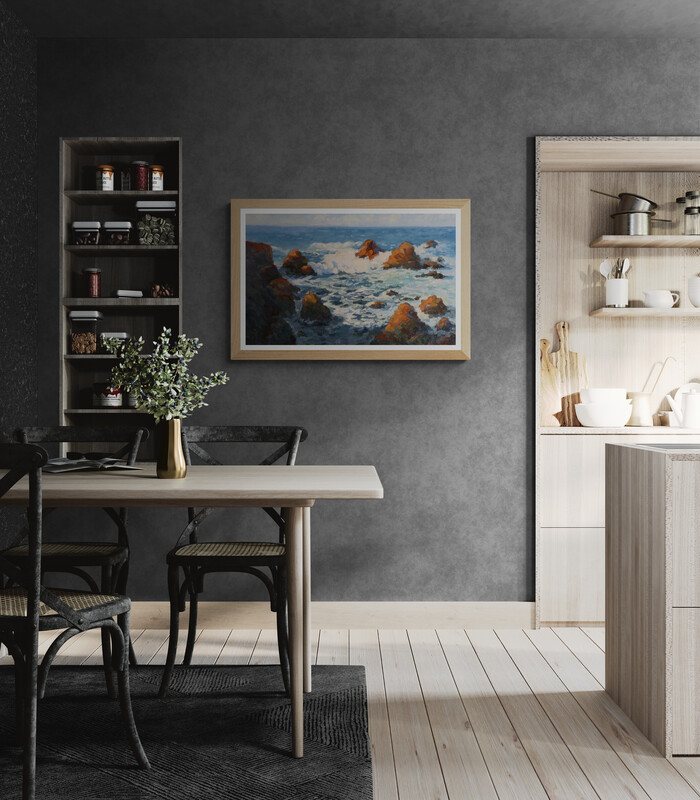 Impression of sea action against the coast and rocks. Sunrise light effect.