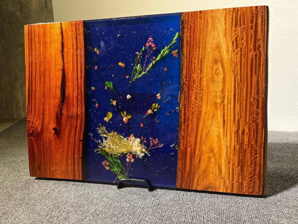 A minimalist piece in both form and feeling, Echo After Petal explores what remains once the bloom has passed. Suspended in dark resin like a twilight sky, faint petals and soft floral traces drift through a quiet field of negative space. It’s a composition of stillness — more suggestion than spectacle — inviting contemplation of memory, absence, and what cannot be held.