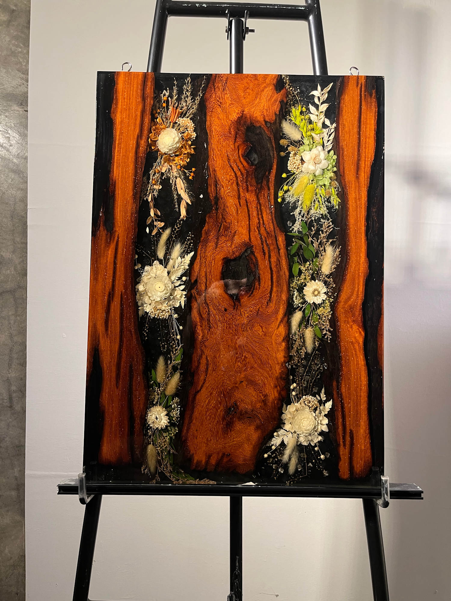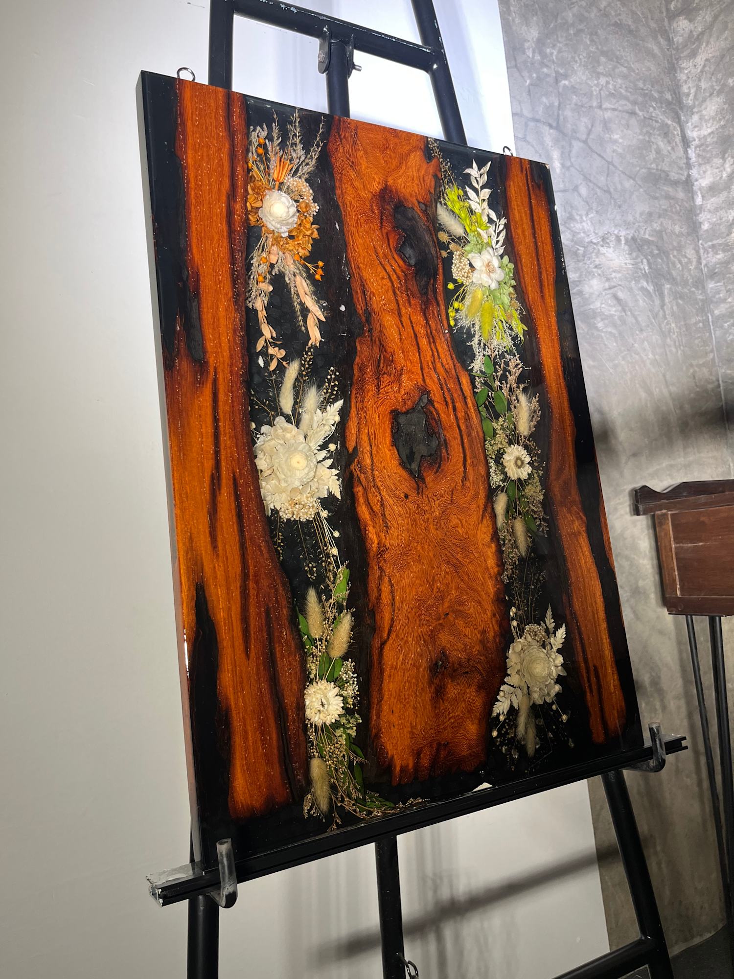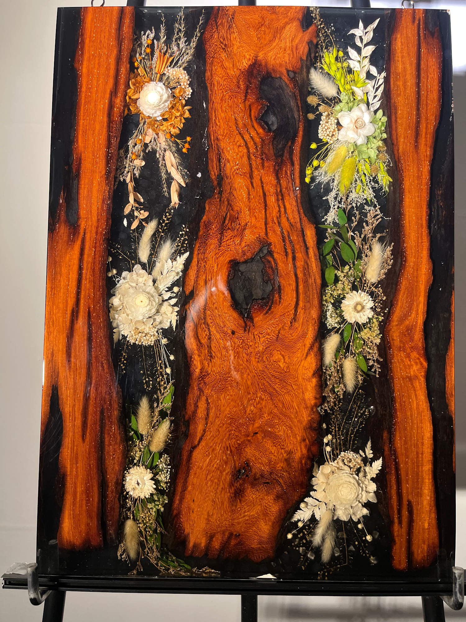 Slightly more dramatic in veining and visual depth, this twin companion features bold grain eyes, burnt edges, and glistening floral clusters adrift in dark resin. A natural echo to its sibling, yet with a stronger voice of its own.