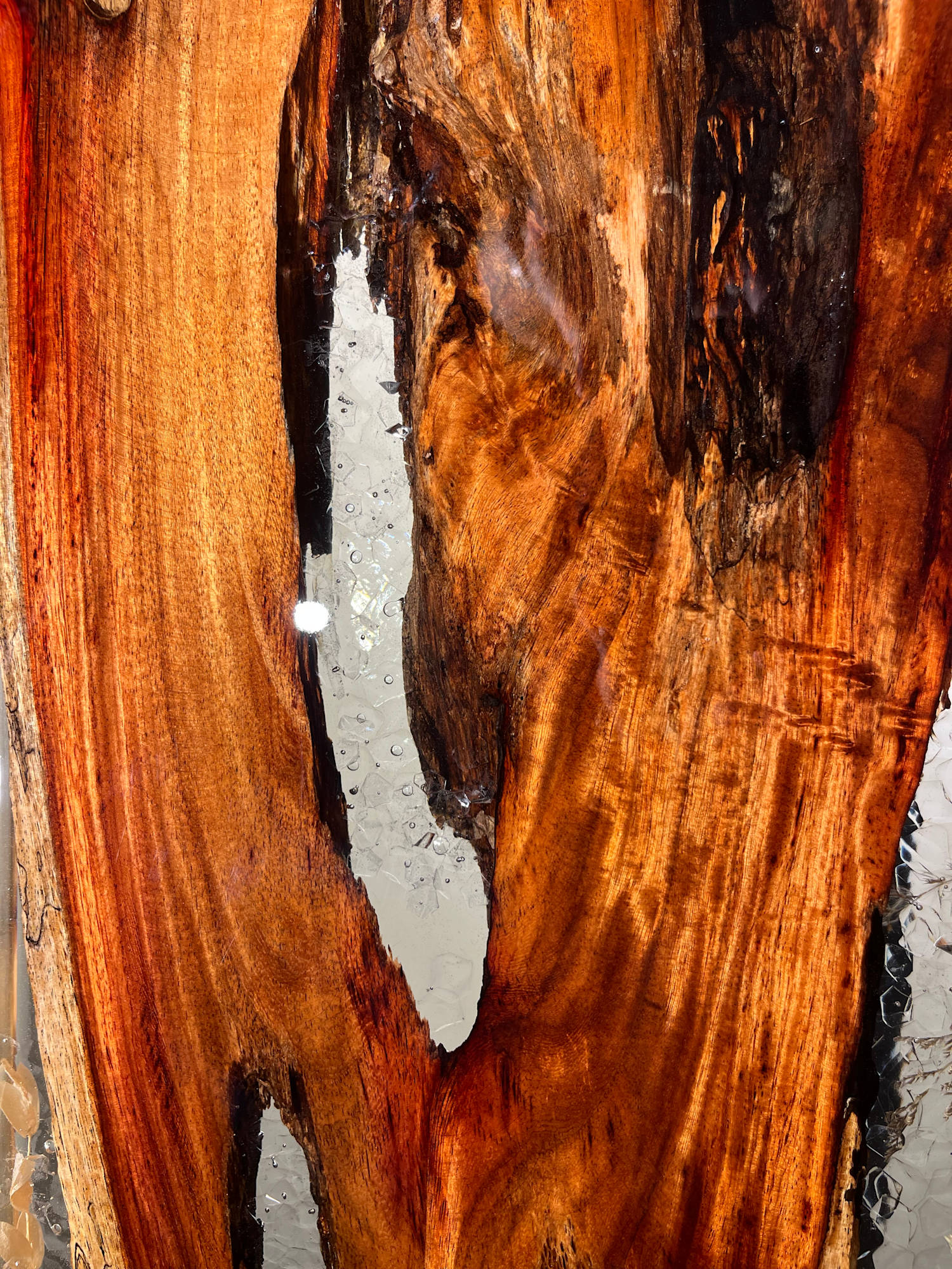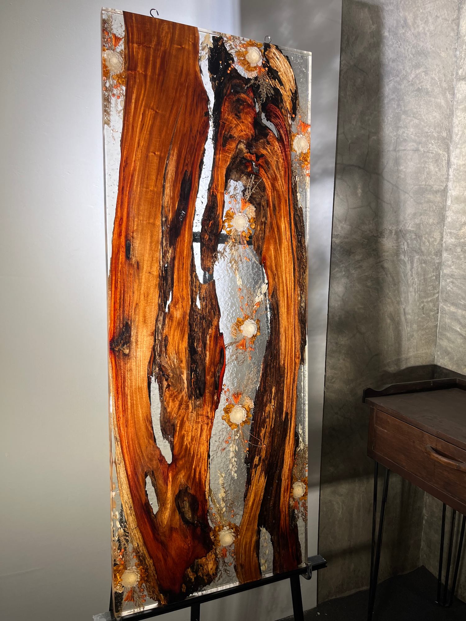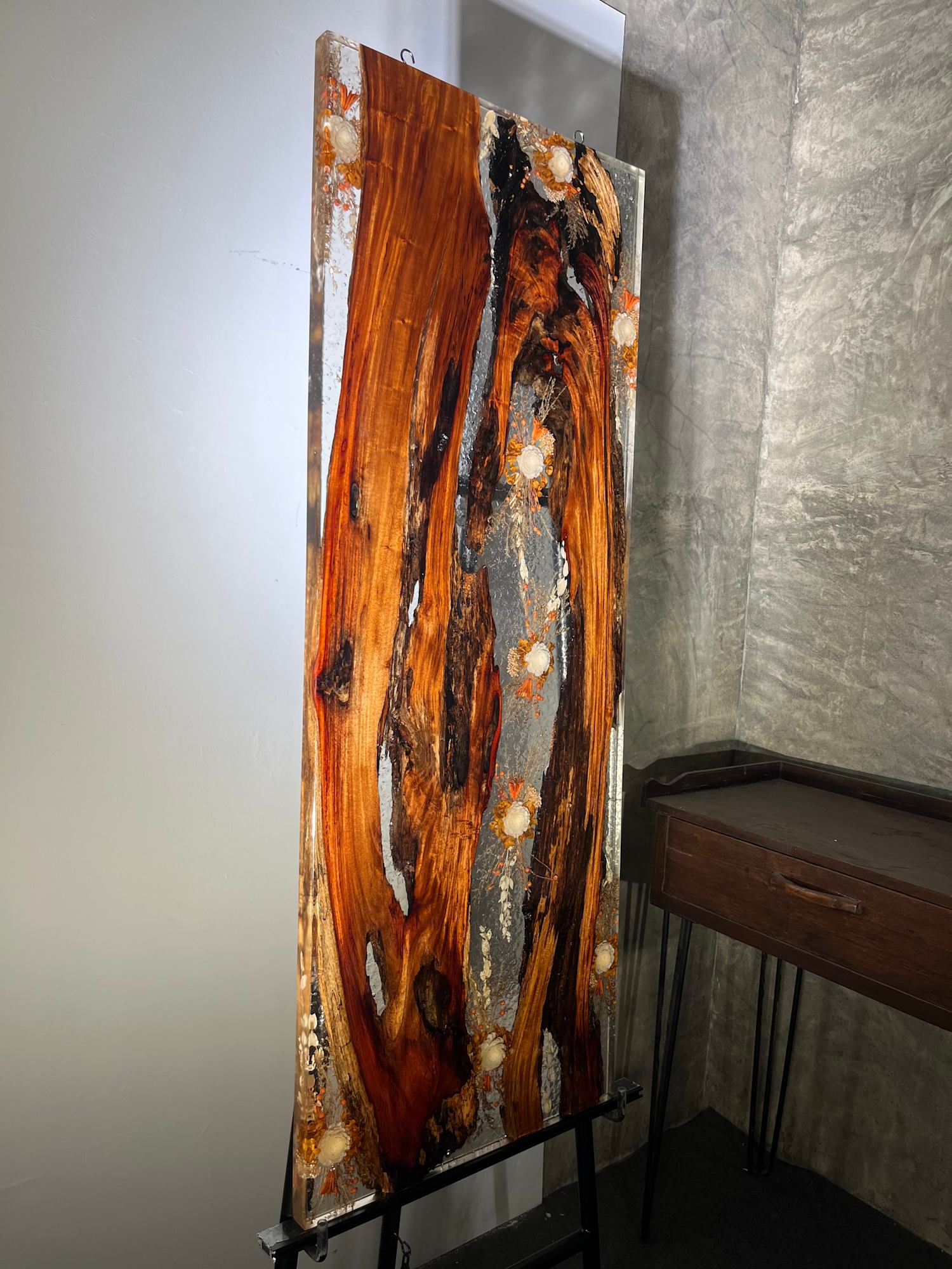 Once destined for fire, this modest slab of reclaimed teak now tells a story of transformation. Embedded in crystalline resin, its raw textures and honest flaws become a study in quiet resilience.