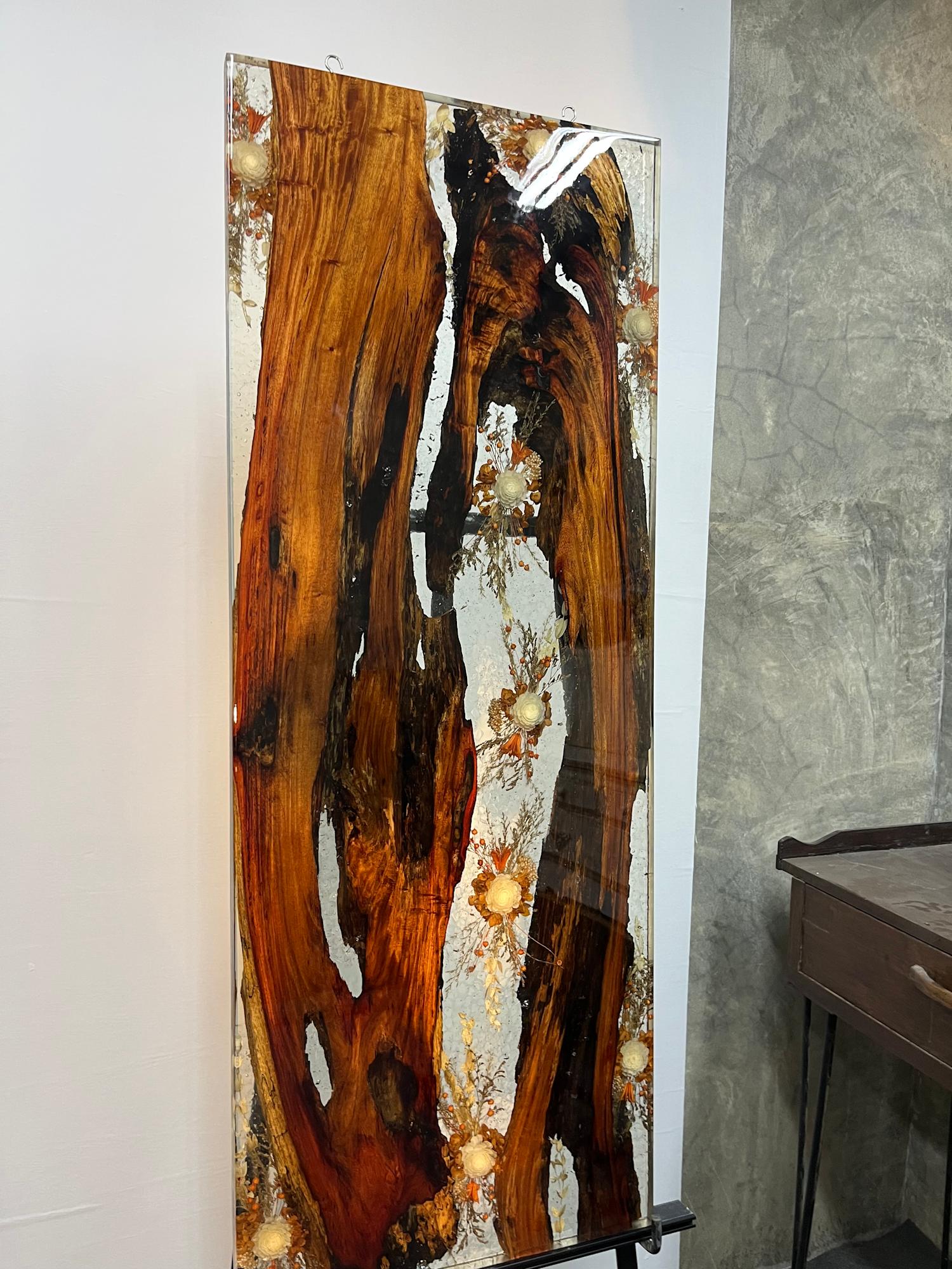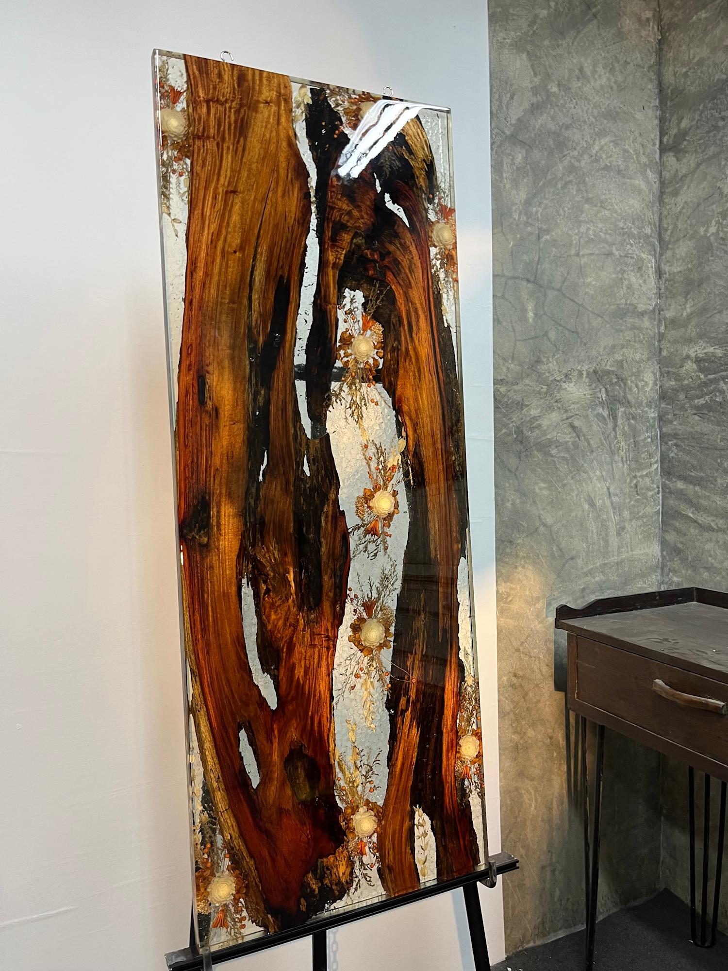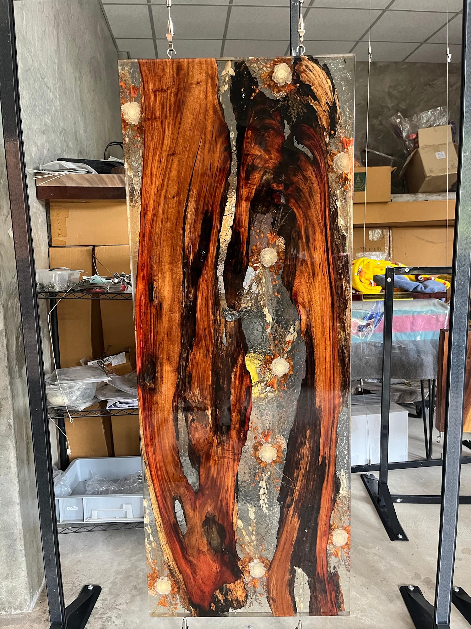 Once destined for fire, this modest slab of reclaimed teak now tells a story of transformation. Embedded in crystalline resin, its raw textures and honest flaws become a study in quiet resilience.