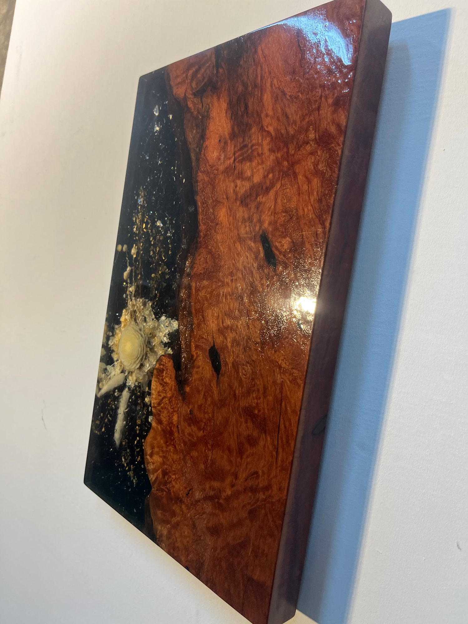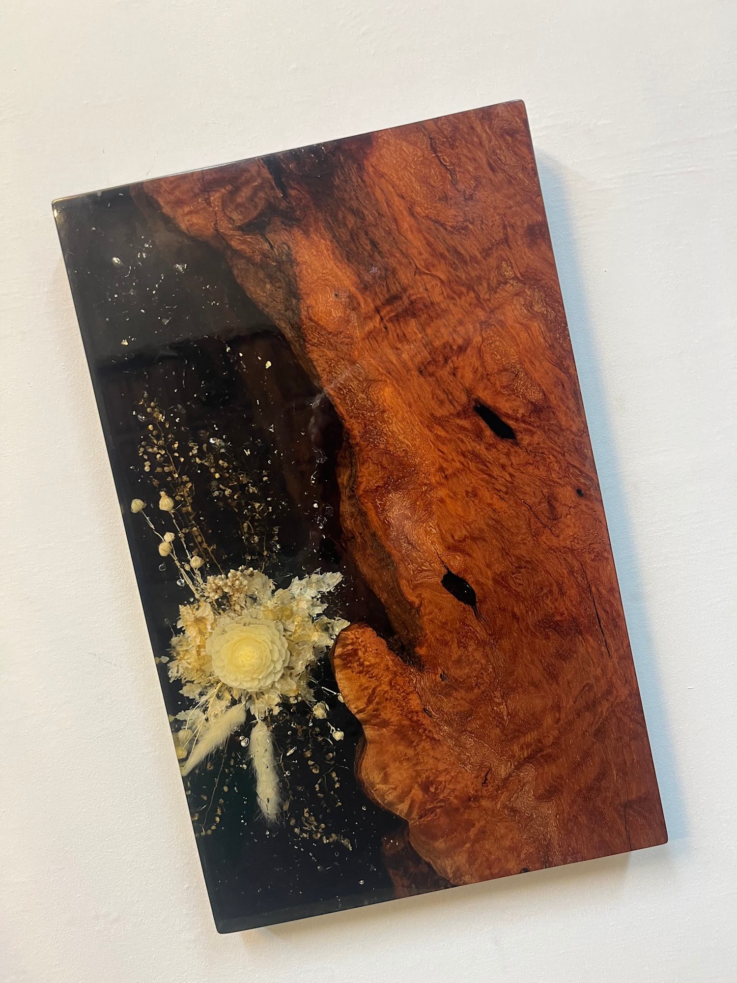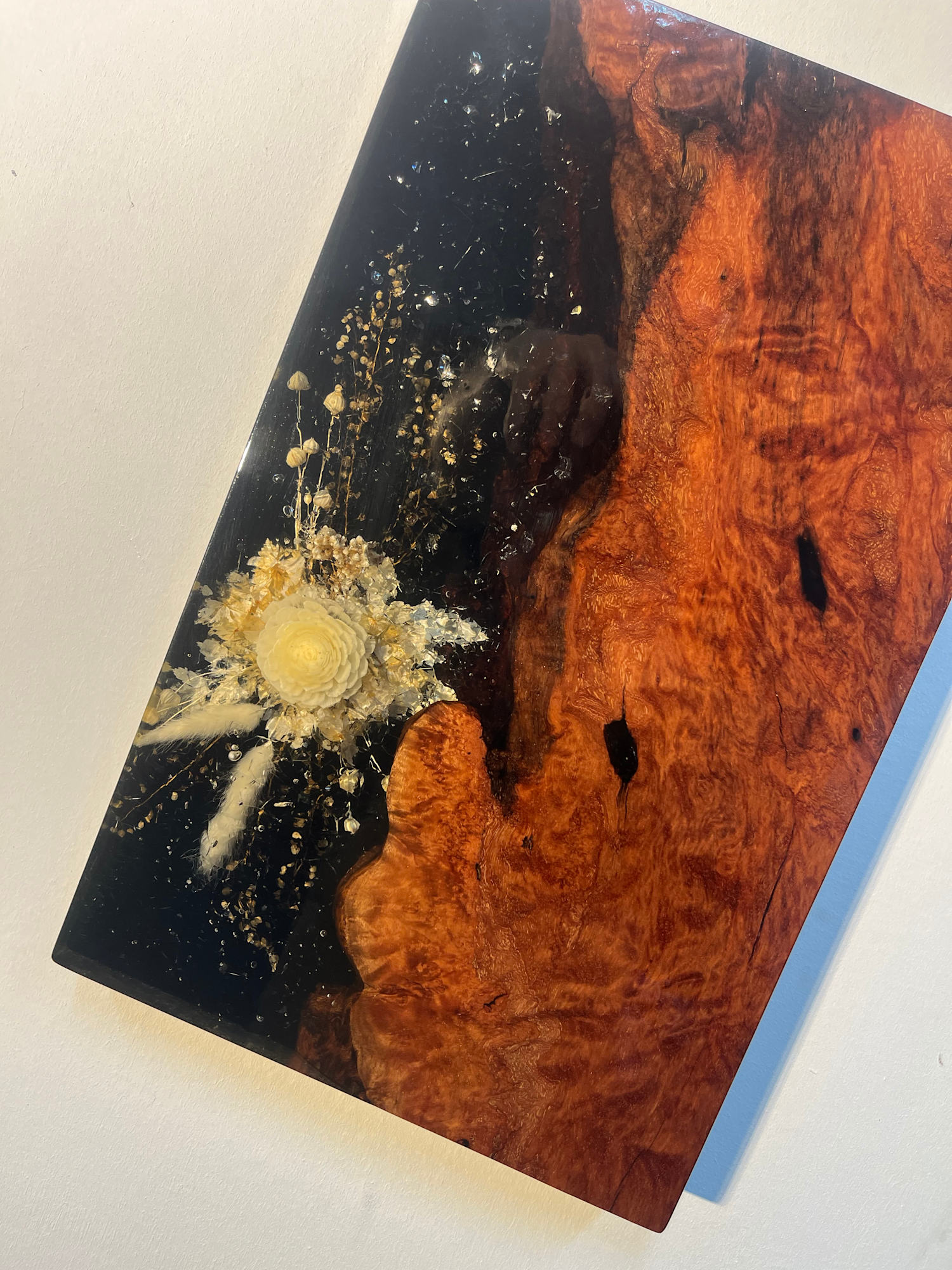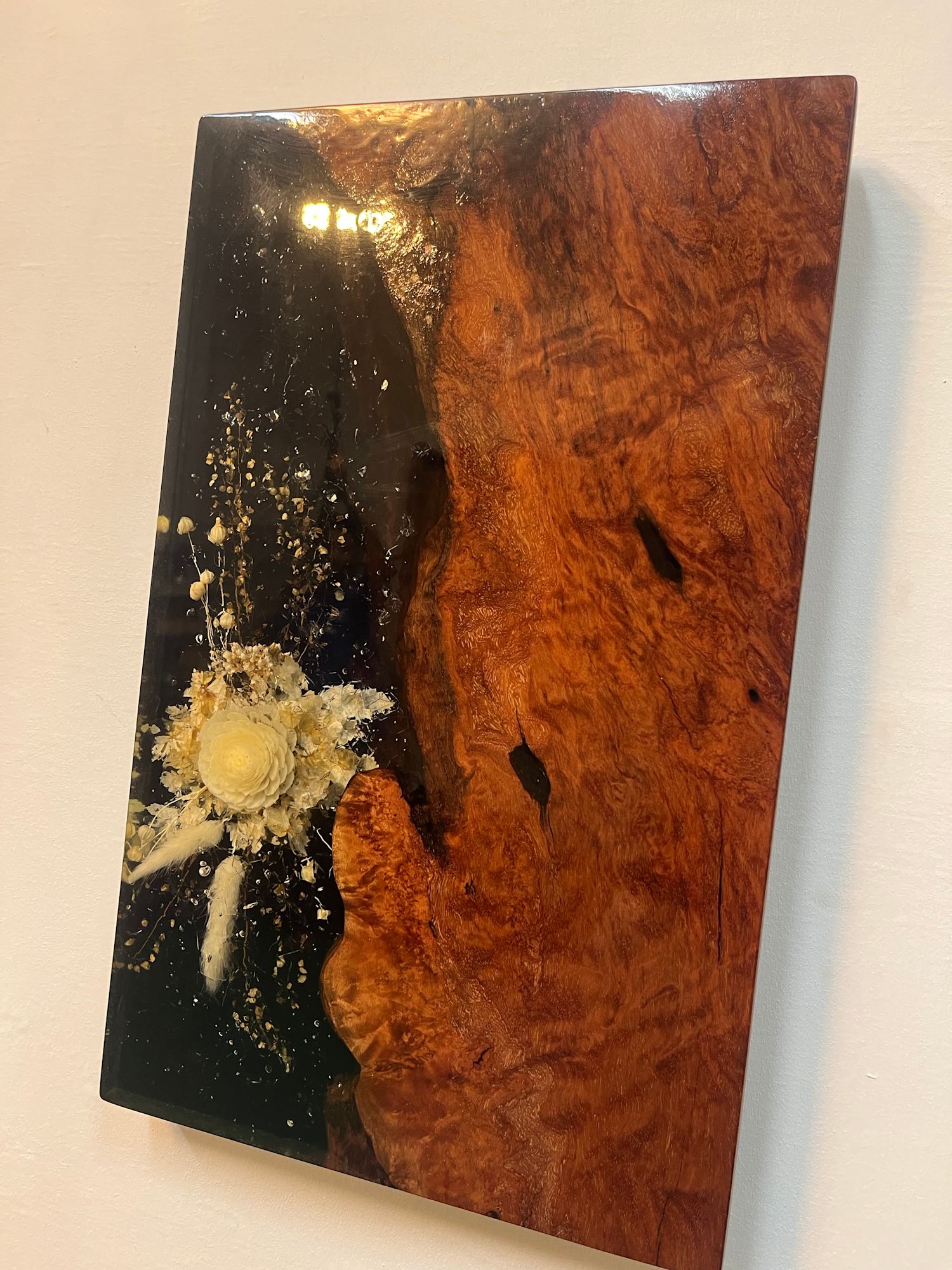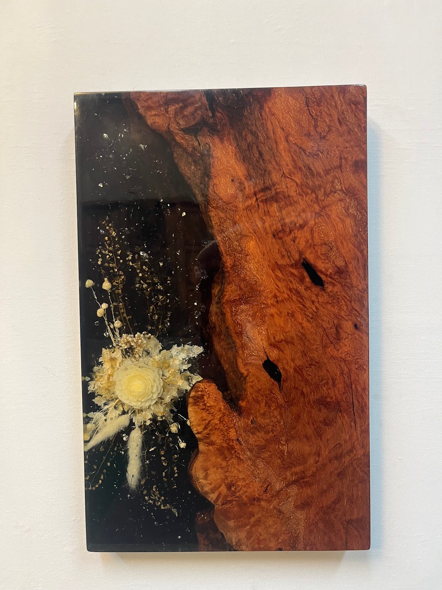 Lychee wood panel with vibrant resin highlights evoking a burst of rose-colored petals.