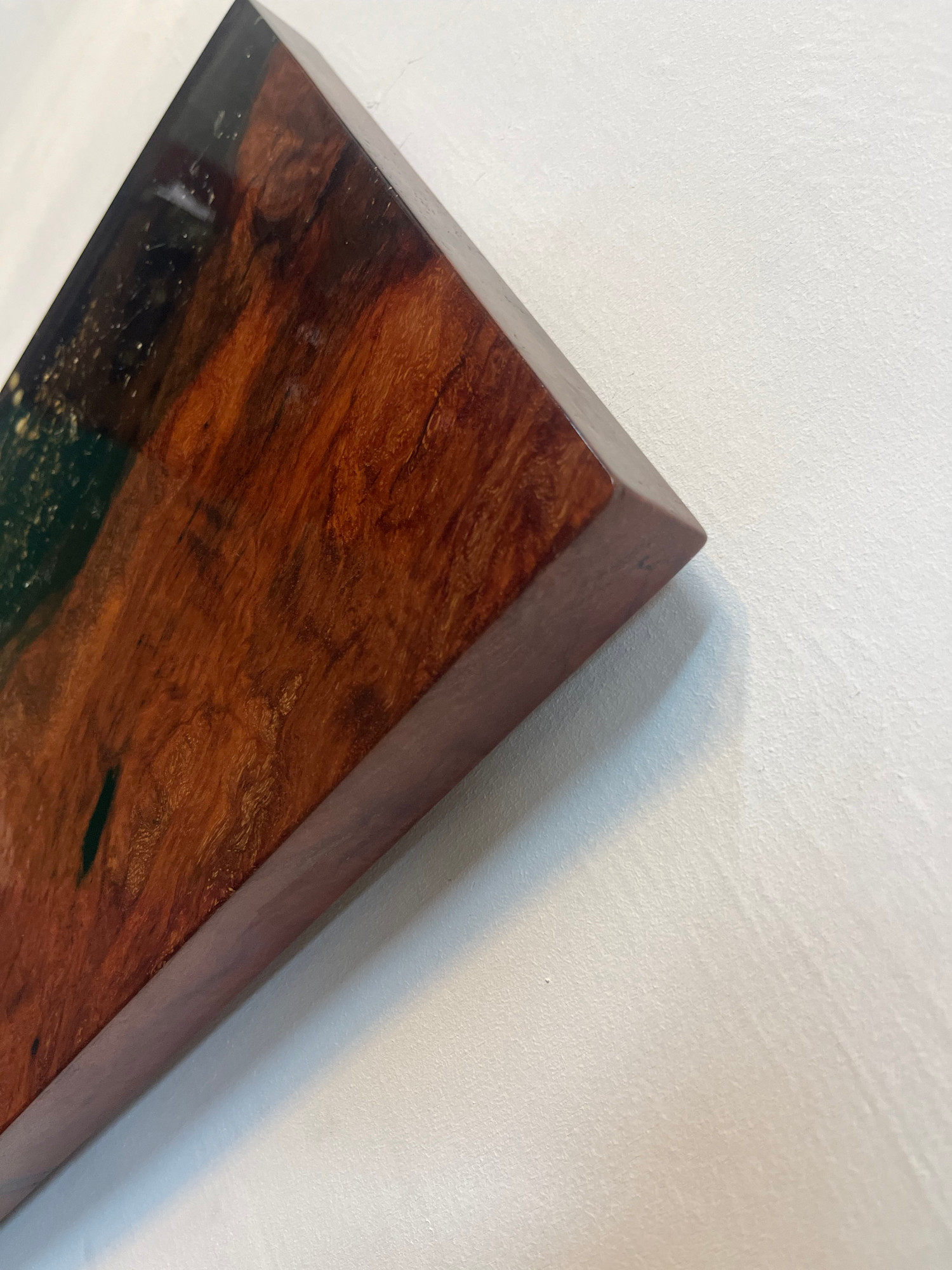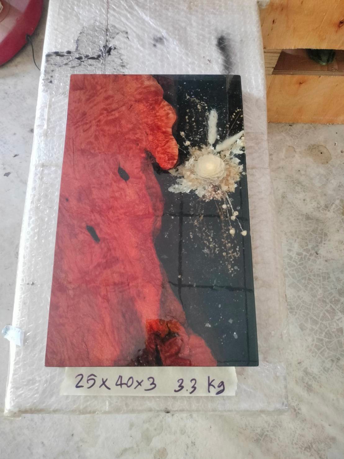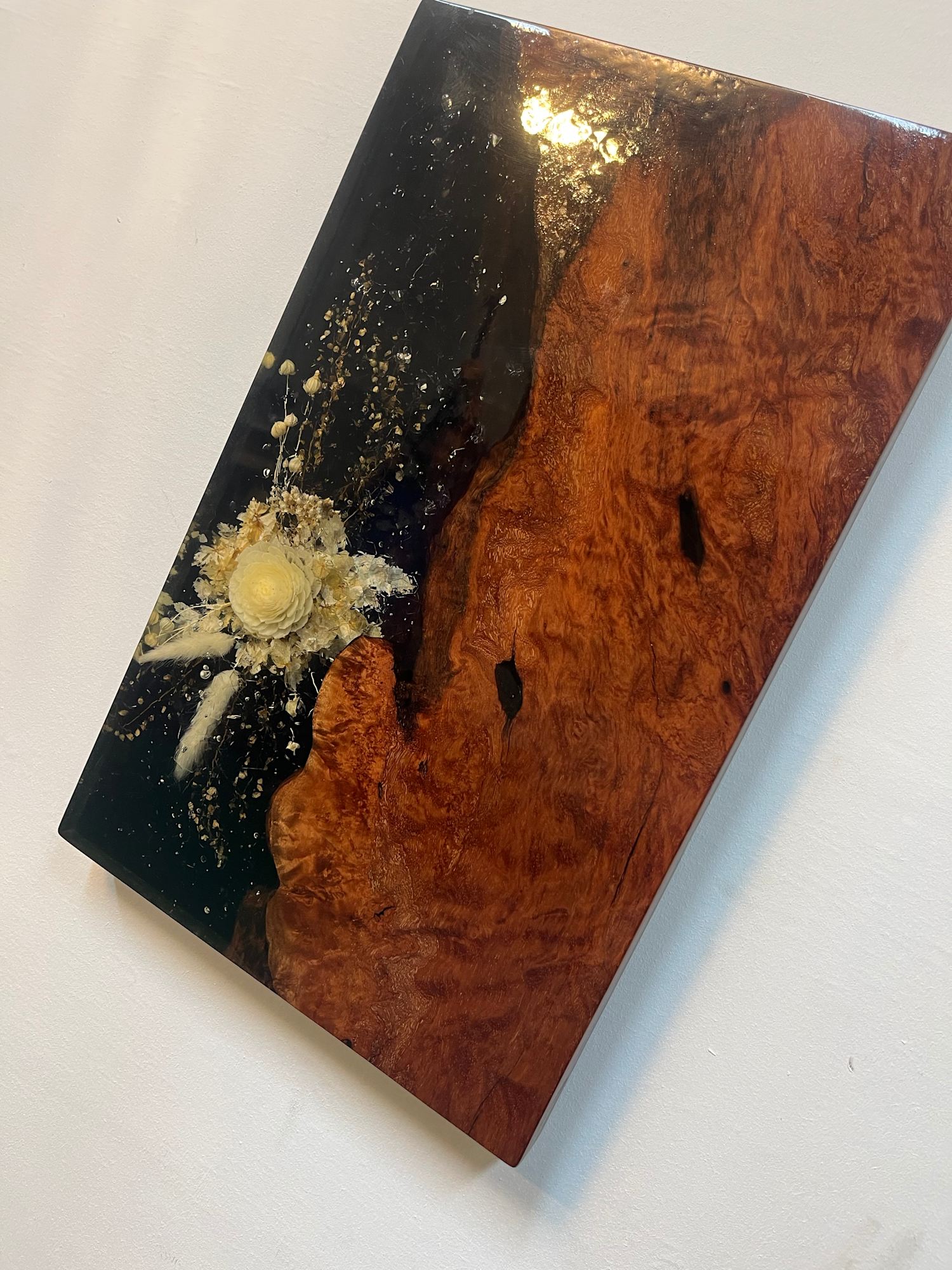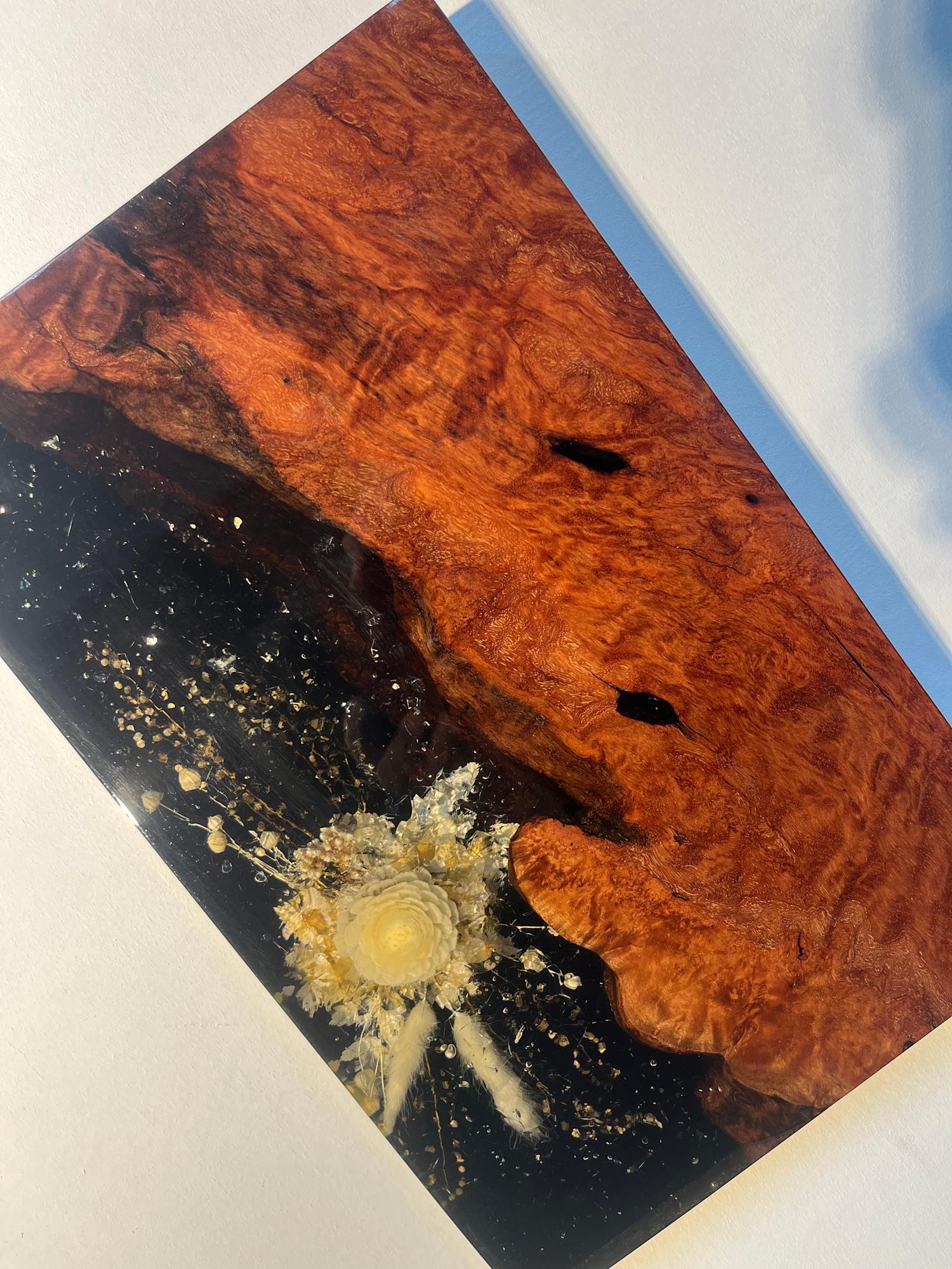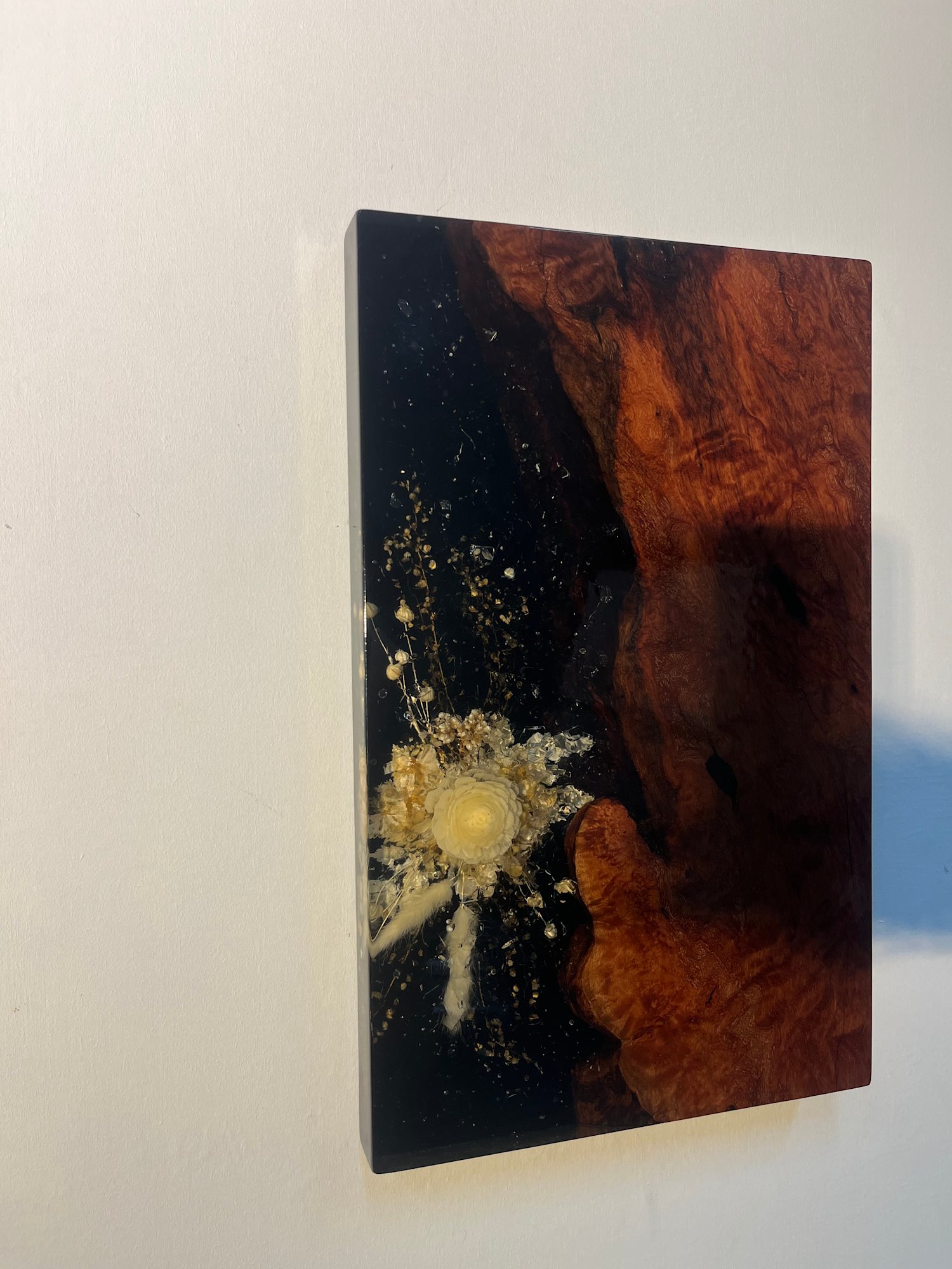 Lychee wood panel with vibrant resin highlights evoking a burst of rose-colored petals.