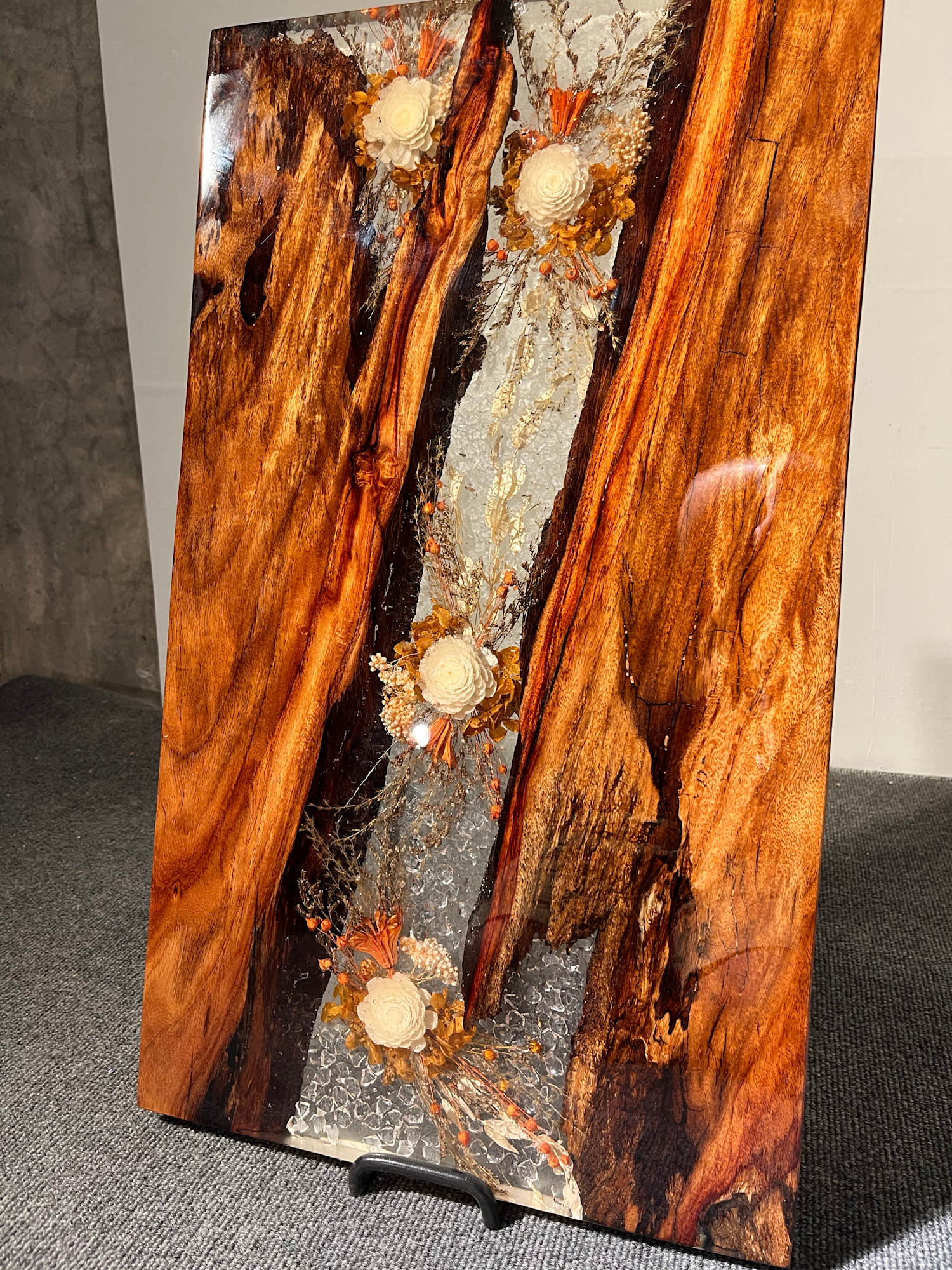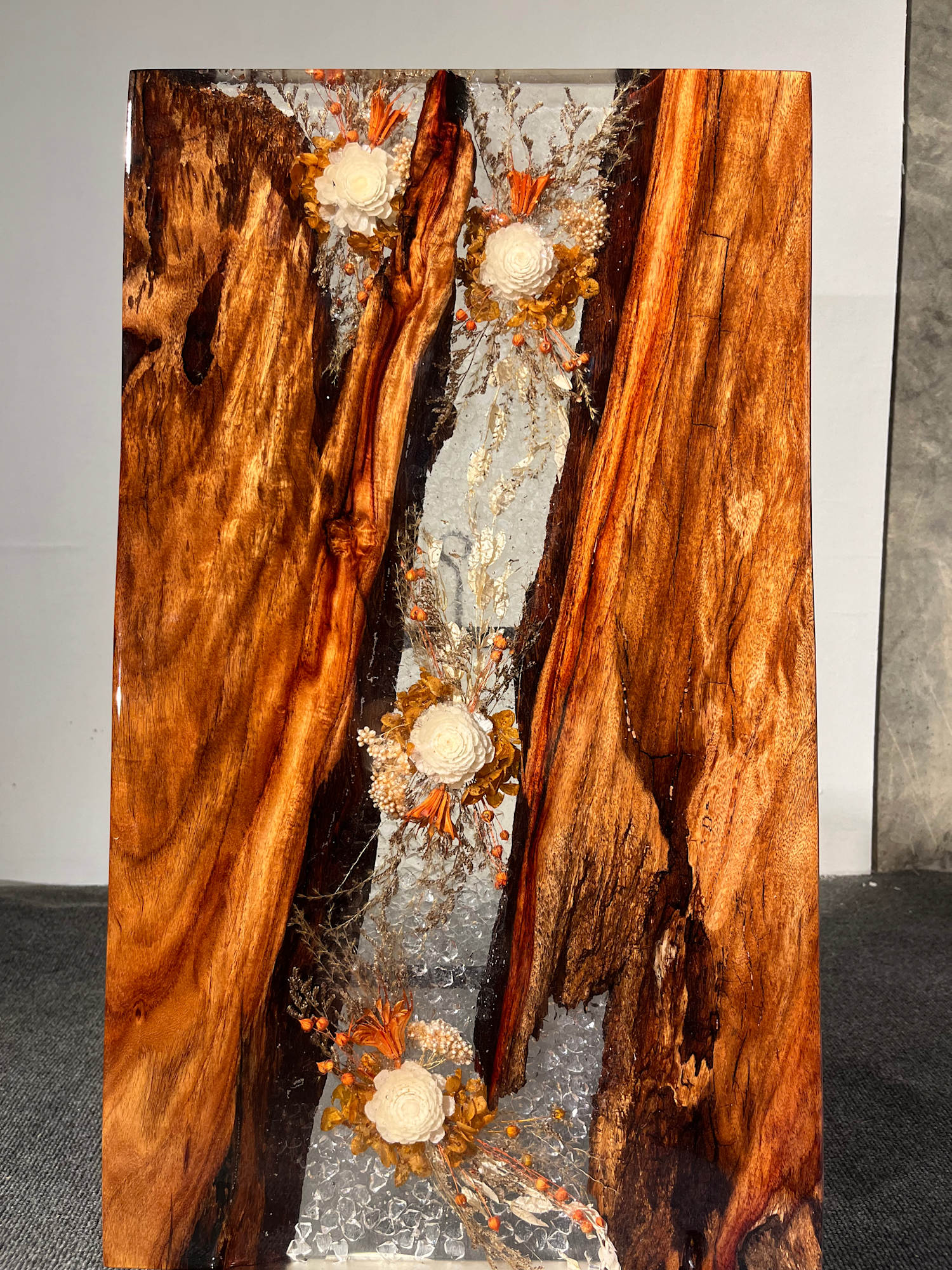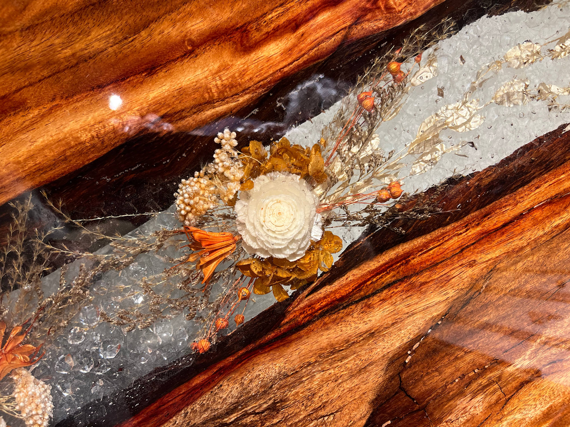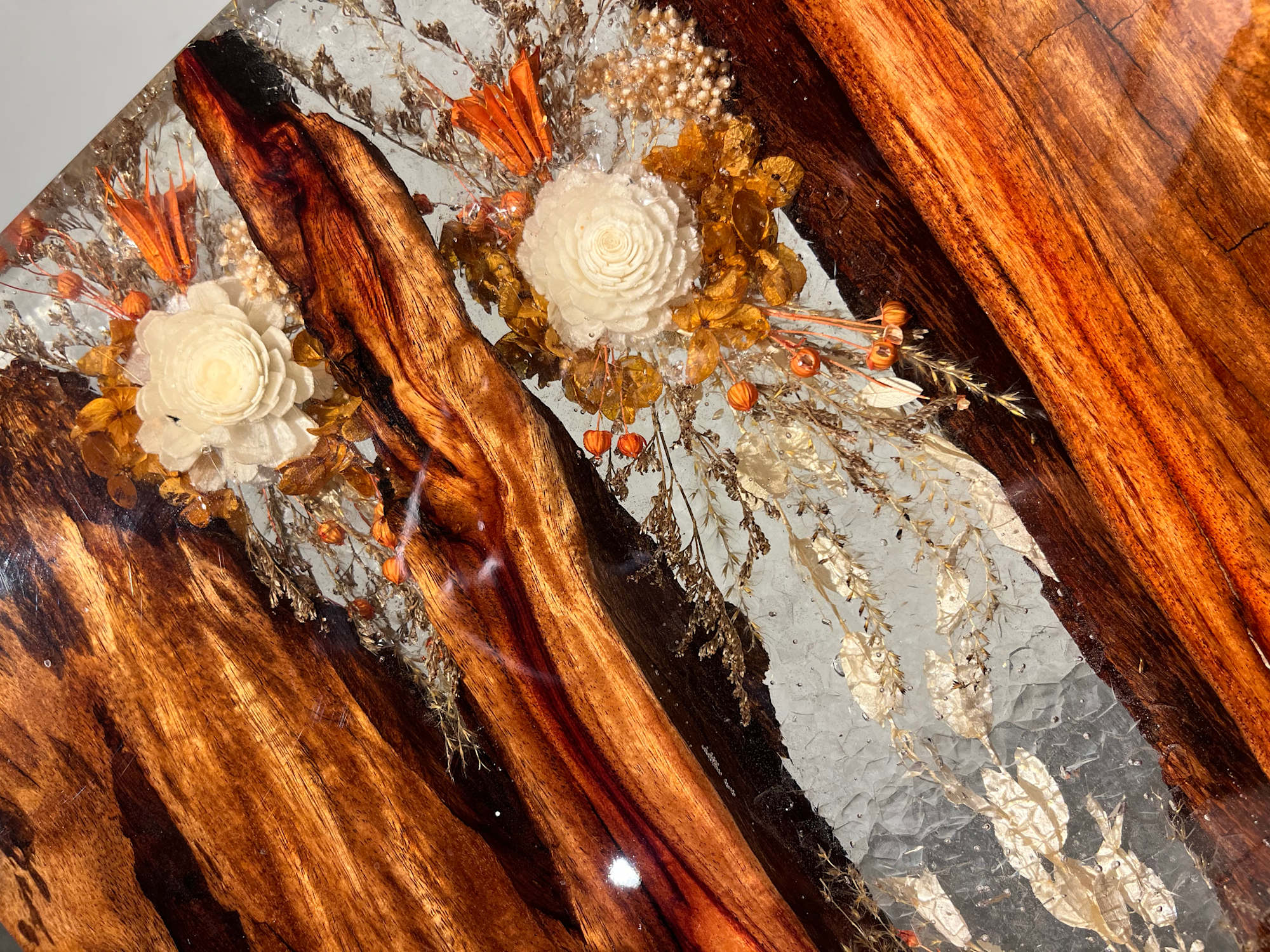A gentle drift of blossoms glides across an eggshell resin field, now enhanced with a high-gloss finish that magnifies the crystal textures and delicate florals. Light dances across the surface, adding a dreamlike shimmer to the scene. Suspended in mid-air, each bloom feels like a moment paused — a meditation on the space between presence and memory.