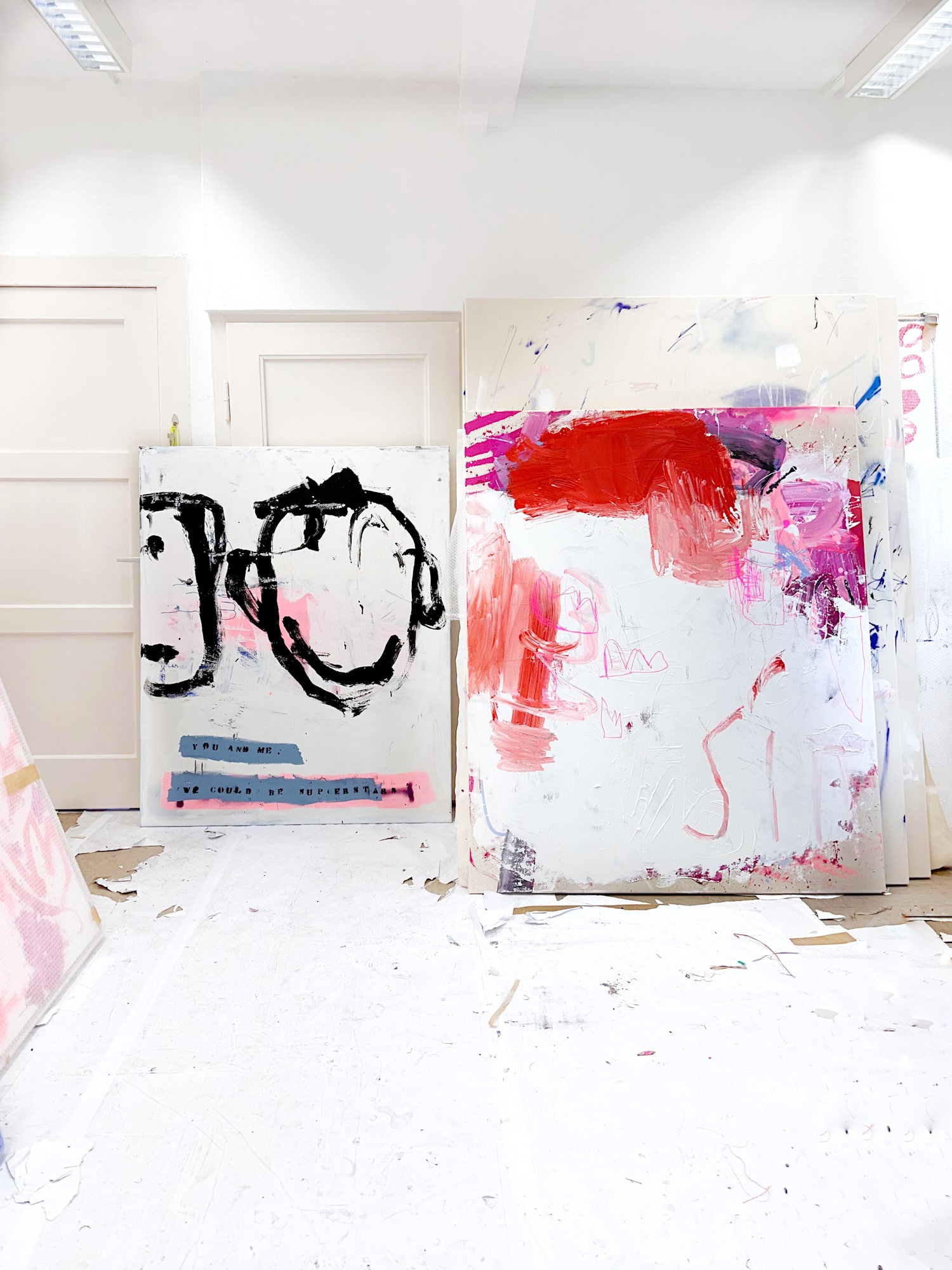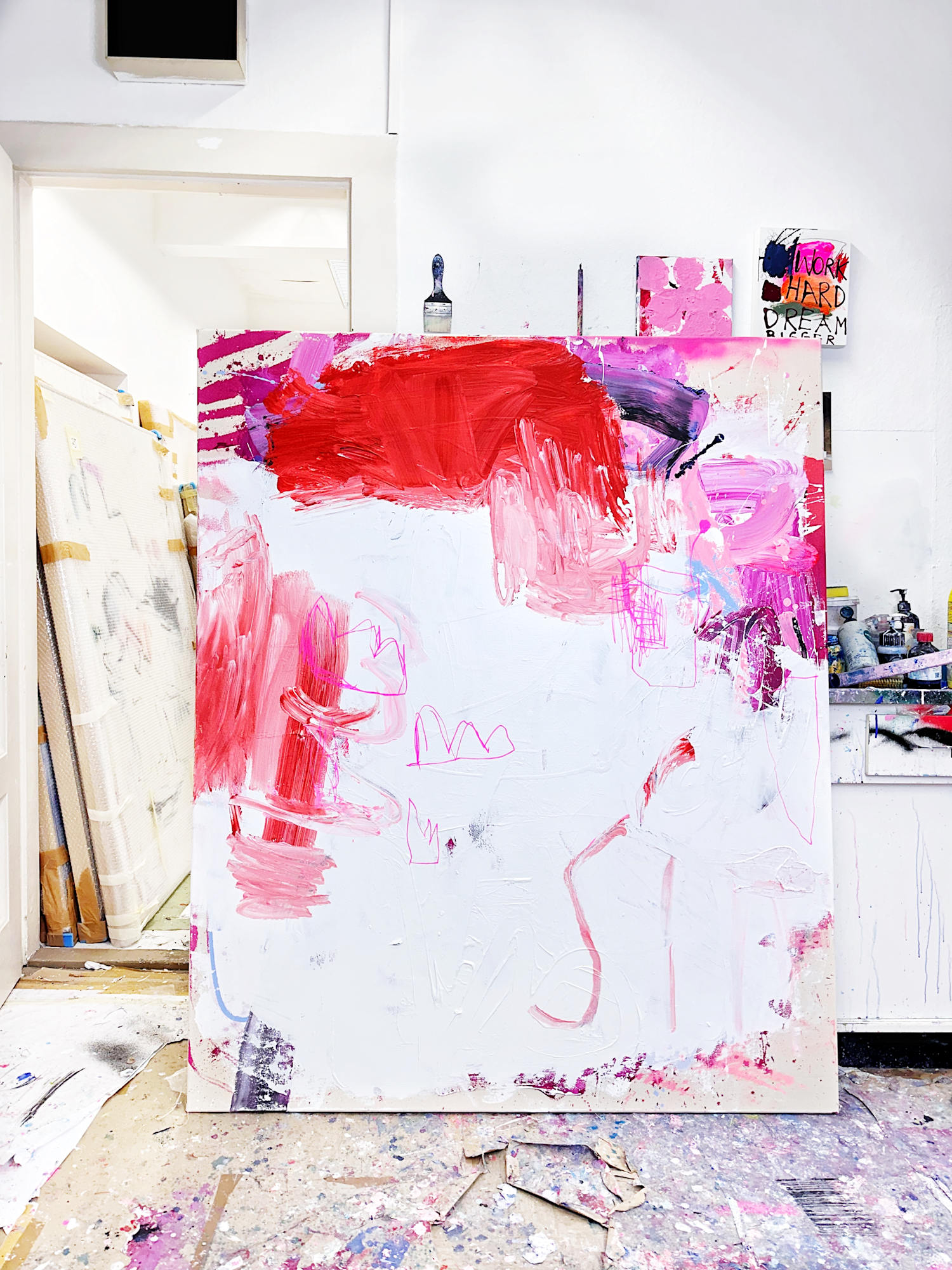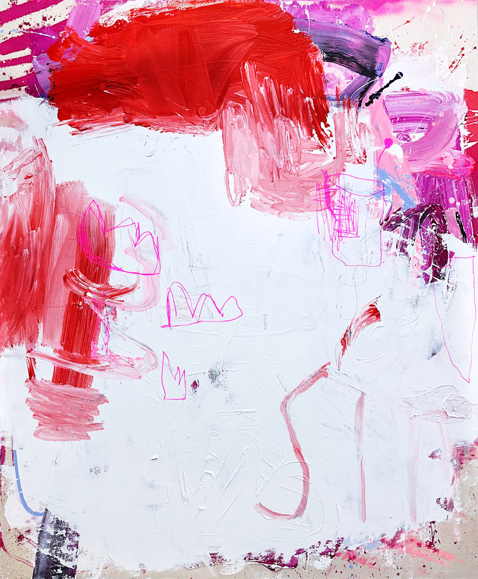 • Acrylics, oil, spray paint, marker, ink on raw canvas