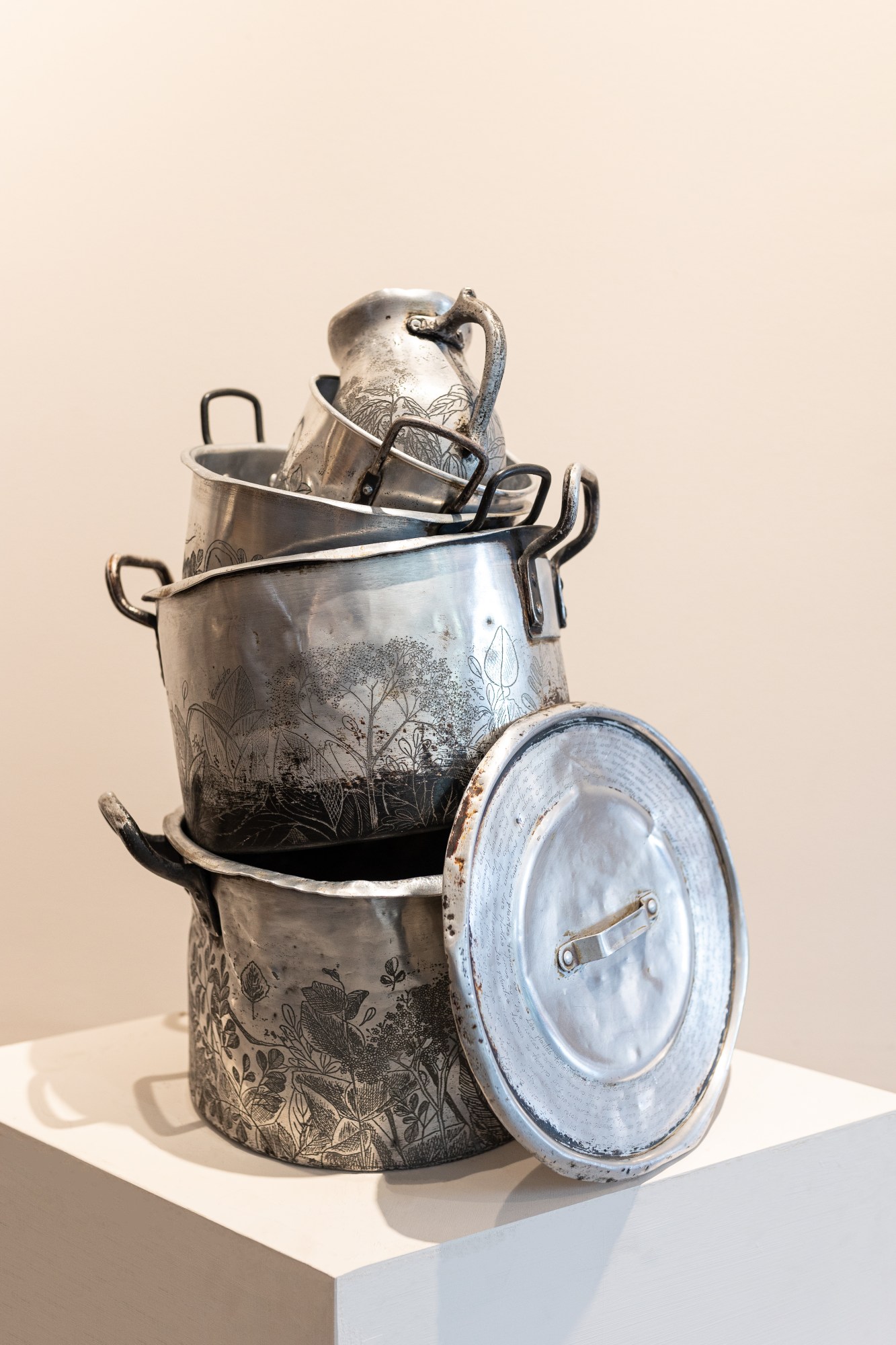 En la instalación de la serie Brebajes, las ollas y las plantas en ellas representadas son contenedoras de sabidurías, de tiempo y de secretos; ellas despiertan en nosotros una conexión con lo más propio, con la raíz, con aquello que nos constituye y donde encontramos refugio y un lugar seguro.