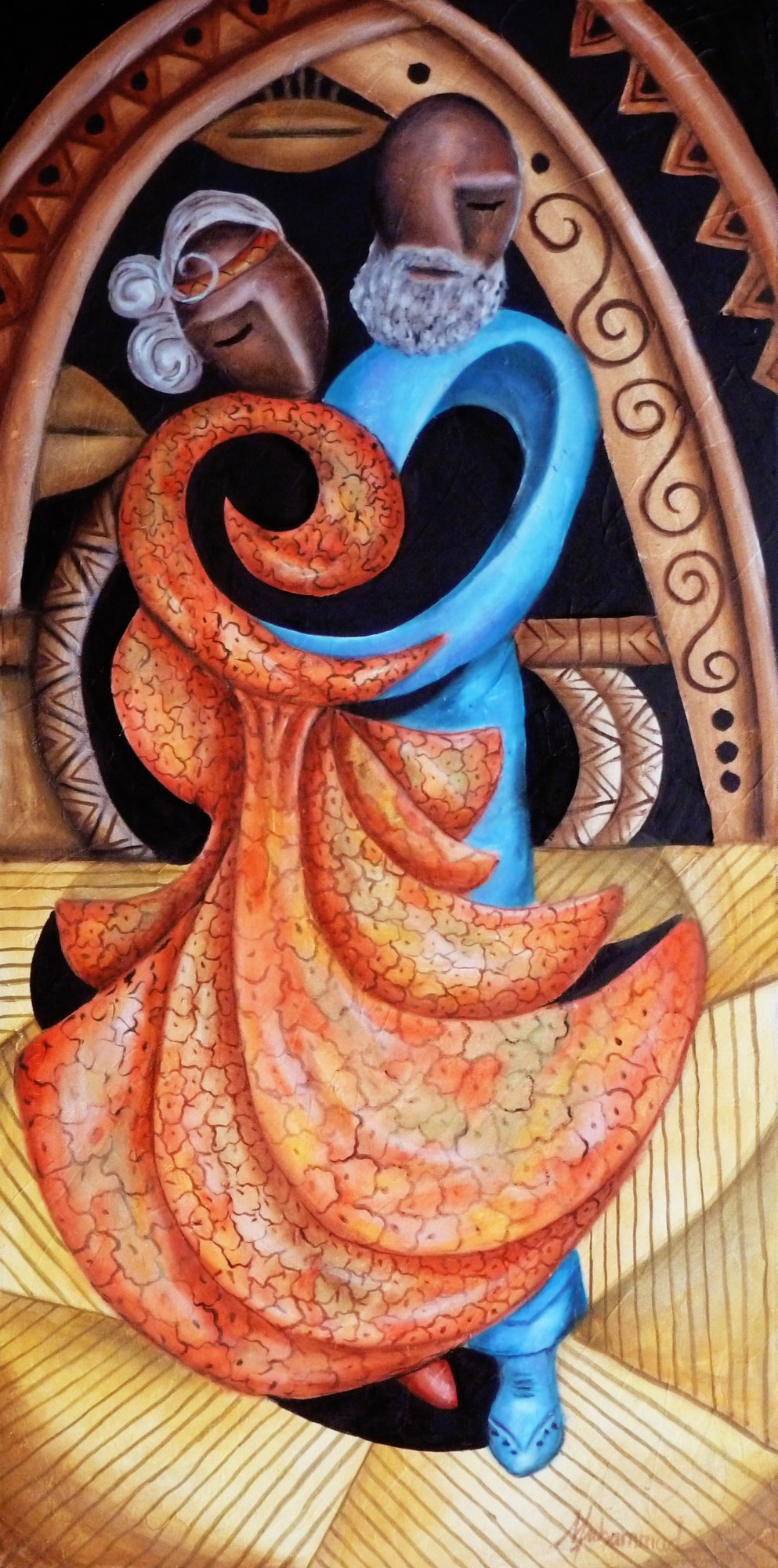 The seniors of a family, representing years of wisdom, guidance and traditions for the younger generations to come, set the solid foundation of a family and it's growth. Using my signature style of Plastic Space or "Plasticism" abstraction, I have captured the private loving moment between these two Seniors as they sway together to an oldie but goodie slow dance. I have added rich cultural elements to the background bringing another element into this image.